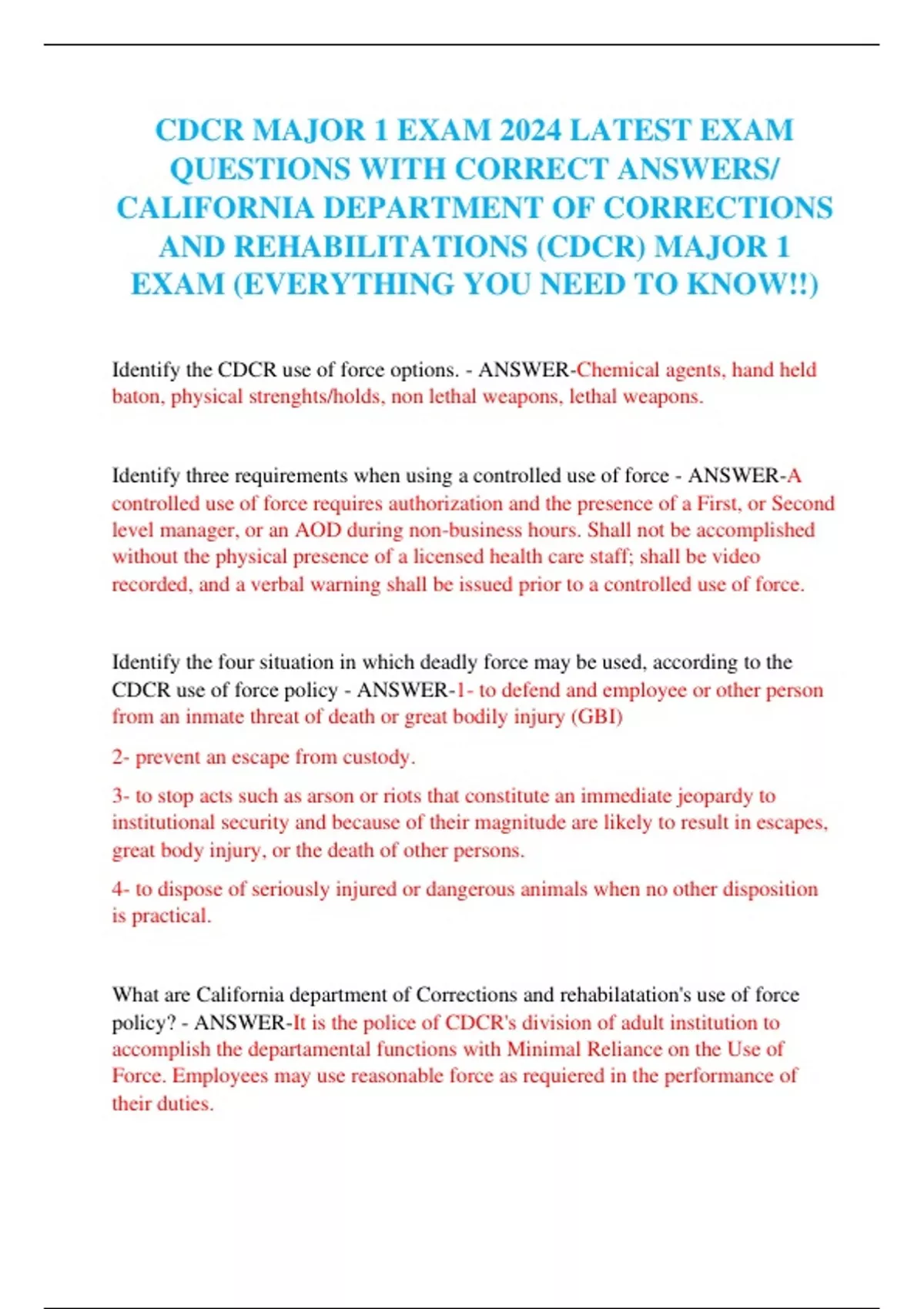 CDCR MAJOR 1 EXAM 2024 LATEST EXAM QUESTIONS WITH CORRECT ANSWERS/ CALIFORNIA DEPARTMENT OF CORRECTIONS AND REHABILITATIONS (CDCR) MAJOR 1 EXAM (EVERYTHING YOU NEED TO KNOW!!)