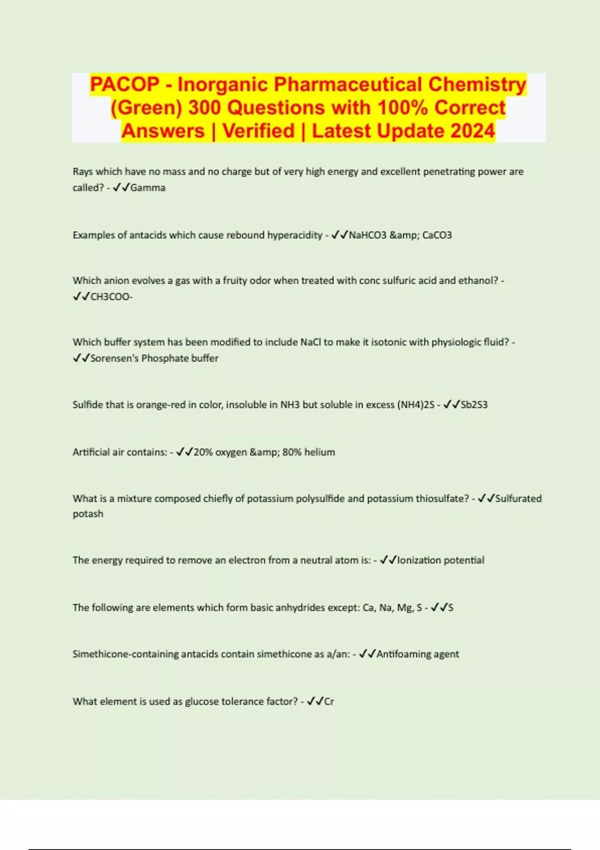 PACOP - Inorganic Pharmaceutical Chemistry (Green) 300 Questions with 100% Correct Answers | Verified | Latest Update 2024