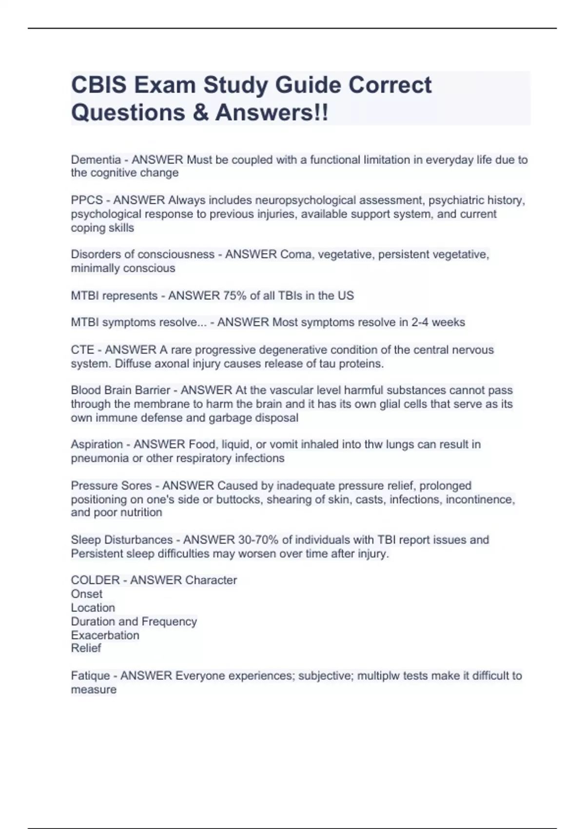 Dementia - ANSWER Must be coupled with a functional limitation in everyday life due to the cognitive change PPCS - ANSWER Always includes neuropsychological assessment, psychiatric history, psychological response to previous injuries, available support system, and current coping skills Disorders of consciousness - ANSWER Coma, vegetative, persistent vegetative, minimally conscious MTBI represents - ANSWER 75% of all TBIs in the US MTBI symptoms resolve... - ANSWER Most symptoms resolve in 2-4 weeks CTE - ANSWER A rare progressive degenerative condition of the central nervous system. Diffuse axonal injury causes release of tau proteins. Blood Brain Barrier - ANSWER At the vascular level harmful substances cannot pass through the membrane to harm the brain and it has its own glial cells that serve as its own immune defense and garbage disposal