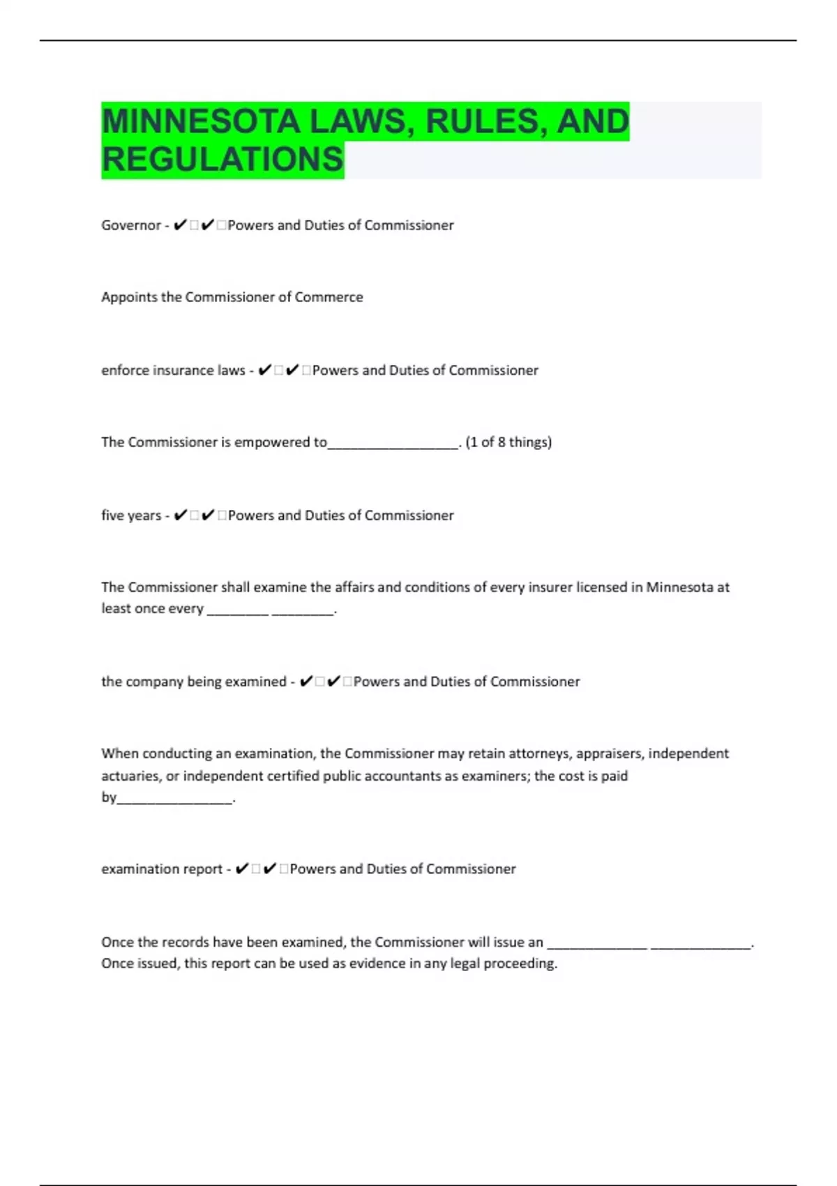 Governor - ️️Powers and Duties of Commissioner Appoints the Commissioner of Commerce enforce insurance laws - ️️Powers and Duties of Commissioner The Commissioner is empowered to_________________. (1 of 8 things) five years - ️️Powers and Duties of Commissioner The Commissioner shall examine the affairs and conditions of every insurer licensed in Minnesota at least once every ________ ________. the company being examined - ️️Powers and Duties of Commissioner When conducting an examination, the Commissioner may retain attorneys, appraisers, independent actuaries, or independent certified public accountants as examiners; the cost is paid by_______________. examination report - ️️Powers and Duties of Commissioner Once the records have been examined, the Commissioner will issue an _____________ _____________. Once issued, this report can be used as evidence in any legal proceeding.