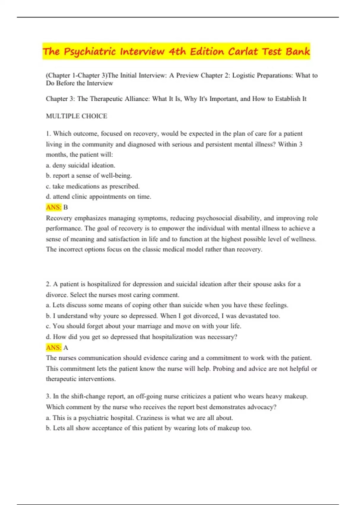 The Psychiatric Interview 4th Edition Carlat Test Bank 1.Which outcome, focused on recovery, would be expected in the plan of care for a patient living in the community and diagnosed with serious and persistent mental illness? Within 3 months, the patient will: suicidal ideation. t a sense of well-being. medications as prescribed. d clinic appointments on time. ANS: B Recovery emphasizes managing symptoms, reducing psychosocial disability, and improving role performance. The goal of recovery is to empower the individual with mental illness to achieve a sense of meaning and satisfaction in life and to function at the highest possible level of wellness. The incorrect options focus on the classic medical model rather than recovery. 2.A patient is hospitalized for depression and suicidal ideation after their spouse asks for a divorce. Select the nurses most caring comment. a.Lets discuss some means of coping other than suicide when you have these feelings. b.I understand why youre so depressed. When I got divorced, I was devastated too. c.You should forget about your marriage and move on with your life. d.How did you get so depressed that hospitalization was necessary? ANS: A The nurses communication should evidence caring and a commitment to work with the patient. This commitment lets the patient know the nurse will help. Probing and advice are not helpful or therapeutic interventions. 3.In the shift-change report, an off-going nurse criticizes a patient who wears heavy makeup. Which comment by the nurse who receives the report best demonstrates advocacy? a.This is a psychiatric hospital. Craziness is what we are all about. b.Lets all show acceptance of this patient by wearing lots of makeup too. c.Your comments are inconsiderate and inappropriate. Keep the report objective. d.Our patients need our help to learn behaviors that will help them get along in society. ANS: D Accepting patients needs for self-expression and seeking to teach skills that will contribute to their well-being demonstrate respect and are important parts of advocacy. The on-coming nurse needs to take action to ensure that others are not prejudiced against the patient. Humor can be appropriate within the privacy of a shift report but not at the expense of respect for patients. Judging the off-going nurse in a critical way will create conflict. Nurses must show compassion for each other.
