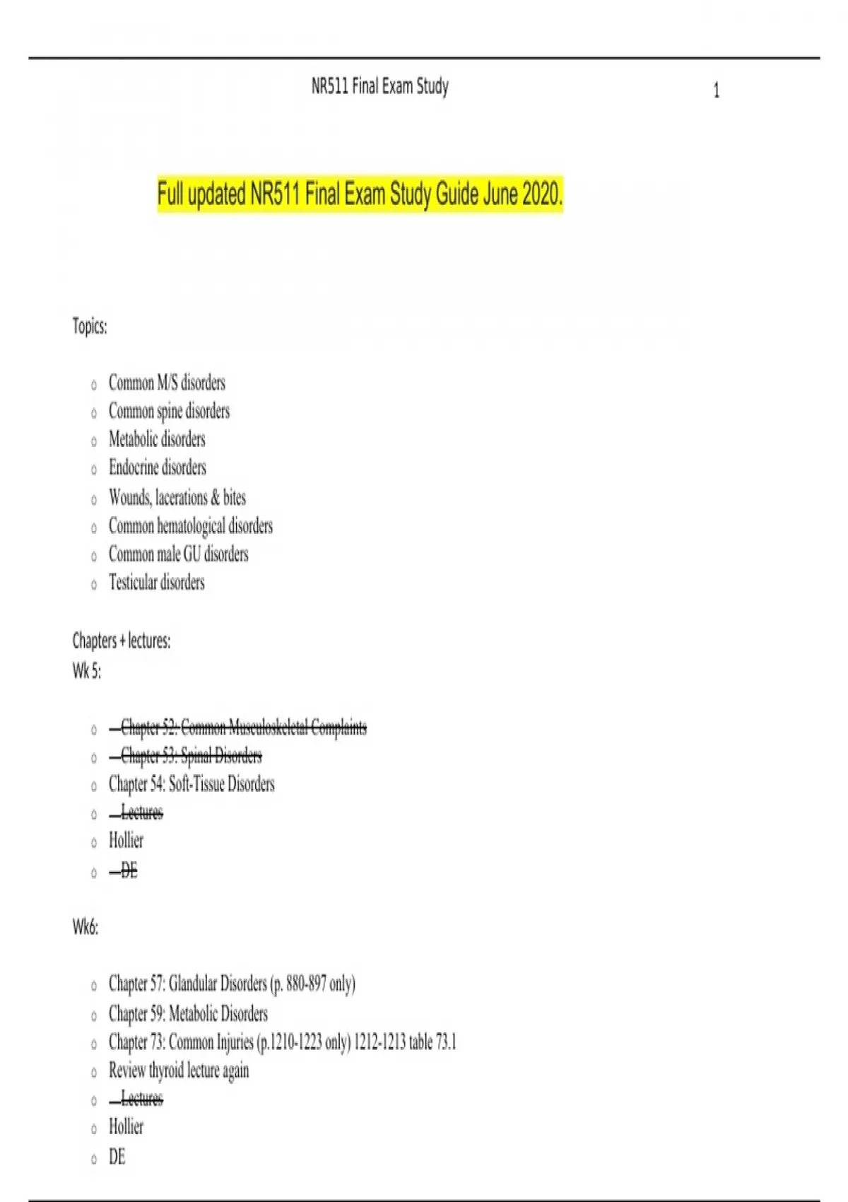 Full updated NR511 Final Exam Study Guide June 2020. Topics: o Common M/S disorders o Common spine disorders o Metabolic disorders o Endocrine disorders o Wounds, lacerations & bites o Common hematological disorders o Common male GU disorders o Testicular disorders Chapters + lectures: Wk 5: o Chapter 52: Common Musculoskeletal Complaints o Chapter 53: Spinal Disorders o Chapter 54: Soft-Tissue Disorders o Lectures o Hollier o DE Wk6: o Chapter 57: Glandular Disorders (p. 880-897 only) o Chapter 59: Metabolic Disorders o Chapter 73: Common Injuries (p. only) table 73.1 o Review thyroid lecture again o Lectures o Hollier o DE Wk7: o Chapter 46: Nocturia in Men (p. 682) & Testicular Pain (p. 685) o Chapter 49: Prostate Disorders o Chapter 50: Penile & Testicular Disorders o Chapter 61: Hematological Disorders o Lectures o Hollier o DE Completion of study guide: IIII 1. Signs and symptoms and management of musculoskeletal sprains/strains/dislocations Signs and symptoms and management of musculoskeletal sprains/strains/dislocations Sprains: stretching or tearing of ligaments that occurs when a joint is forced beyond its normal anatomical range First degree- stretching of ligamentous fibers Second degree- partial tear of part of the ligament with pain and swelling Third degree- complete ligamentous separation Sprain- sudden injury or fall that caused acute pain and swelling that got worse over a few hours, redness and bruising, active and passive ROM decreased. Radiography to rule out fx. Strain: muscle injury caused by excessive tensile stress placed on a muscle that results in stiffness and decreased function -effects muscle or tendon that connects a muscle to a bone, complain of “pulled muscle,” severe cases cause inflammation, swelling, weakness and loss of function-surgery may be needed Management: PRICE (protect, rest, ice, compression, elevation), limitation of activity, physical therapy, NSAIDS, referral to ortho Dislocation- complete separation of 2 bones that form a joint Very painful and cause immobility, need immediate medical attention Referral to orthopedics for possible surgery or reduction with application of cast or splint. four cardinal signs of inflammation (erythema, warmth, pain, or swelling) -SPEW 2. Signs and symptoms and management of spinal disorders (spondylosis, stenosis, etc.) Cervical Spondylosis- neck stiffness, mild aching discomfort with activity. Pain and limited ROM occur with lateral rotation and lateral flexion of the neck toward the affected side. Weakness shoulder abduction- C5. Bicep weakness- C6. Tricep weakness-C7.Myelopathy- leg weakness, gait disturbance, balance problems, difficulty performing fine motor tasks, loss of bowel and bladder. Treatment- cervical traction, PT, pain relievers. Surgery for Myelopathy. Low back pain-Tenderness and decreased range of motion. Positive straight leg test. Treatment- NSAIDS, muscle relaxants, opioids, surgical, self-care, spinal manipulation Stenosis-pseudoclaudication causing radicular pain in the calves, buttocks, and upper thighs of one or both legs. Symptoms progress from a proximal to distal direction. Walking or prolonged standing causes pain and weakness in buttocks and legs. Stooping over helps relieve pain. Positive Romberg. Reflexes diminished. With bowel or bladder symptoms, sphincter tone may be decreased Management- surgical decompression. NSAIDS, folic acid, vitamin b12. PT-flexing the spine.Bicycling. Intermittent use of NSAIDs may be helpful, as well as folic acid or vitamin B12 supplementation in some cases depending on results of laboratory tests. Management revolves around physical therapy or an exercise program that focuses on flexing the spine. Flexion of the spine increases intraspinal volume. Bicycling is one exercise that is done with the spine in flexion. Improving abdominal muscle tone lifts the pelvis anteriorly and flexes the lumbar spine. Reduction of intra-abdominal fat is critical to achieving the objective. Thus, weight loss may be pivotal. Lumbar flexion exercises increase spinal canal volume. Examples include exercise on all fours, arching the back, or in the fetal position. Exercises that extend the spine should be avoided (swayback). 3. Recognition and immediate management of cauda equina syndrome Immediate management of cauda equina syndrome. (P. 829) Cauda equina syndrome is a medical EMERGENCY and requires immediate decompression. If Cauda equina is confirmed, surgical lumbar decompression is necessary to halt neurological deterioration unless surgery is contraindicated for other medical reasons. *Rational on Davis Edge question: Low back pain accompanied by acute onset of urinary retention or overflow incontinence, loss of anal sphincter tone or fecal incontinence, loss of sensation in the buttocks and perineum, and motor weakness in the lower extremities is a red flag for cauda equina syndrome or severe neurologic compromise. Perianal numbness. Cauda equina compression is characterized by bilateral lower extremity weakness, anesthesia, or paresthesia of the perineum and buttocks (saddle anesthesia). There may or may not be bowel or bladder incontinence or bladder retention. When there is neurologic deficit affecting the bowel or bladder, these changes may not be reversed with surgical decompression, 4. Maneuvers and expected findings with joint pain (knee, shoulder, wrist, etc.) Neck pain-Spurling’s. Shoulder pain-Apley scratch test(reaching the scapula). Internal and external flexion. Internal and external abduction. Pain with abduction= early supraspinatus tendinitis and subacromial bursitis=early rotator cuff injuries. Wrist and hand-allen’s test= radial and ulnar arteries. Phalens test=median nerve compression. Tinel’s sign assess for compression neuropathy – tapping over nerve. Finkelsteins test- de Quervains disease. Thumb between finger and point. Knee Pain= Mcmurray, apprehension sign, bulge sign, inspect/palpate to assess effusion. Lachman, drawer sign