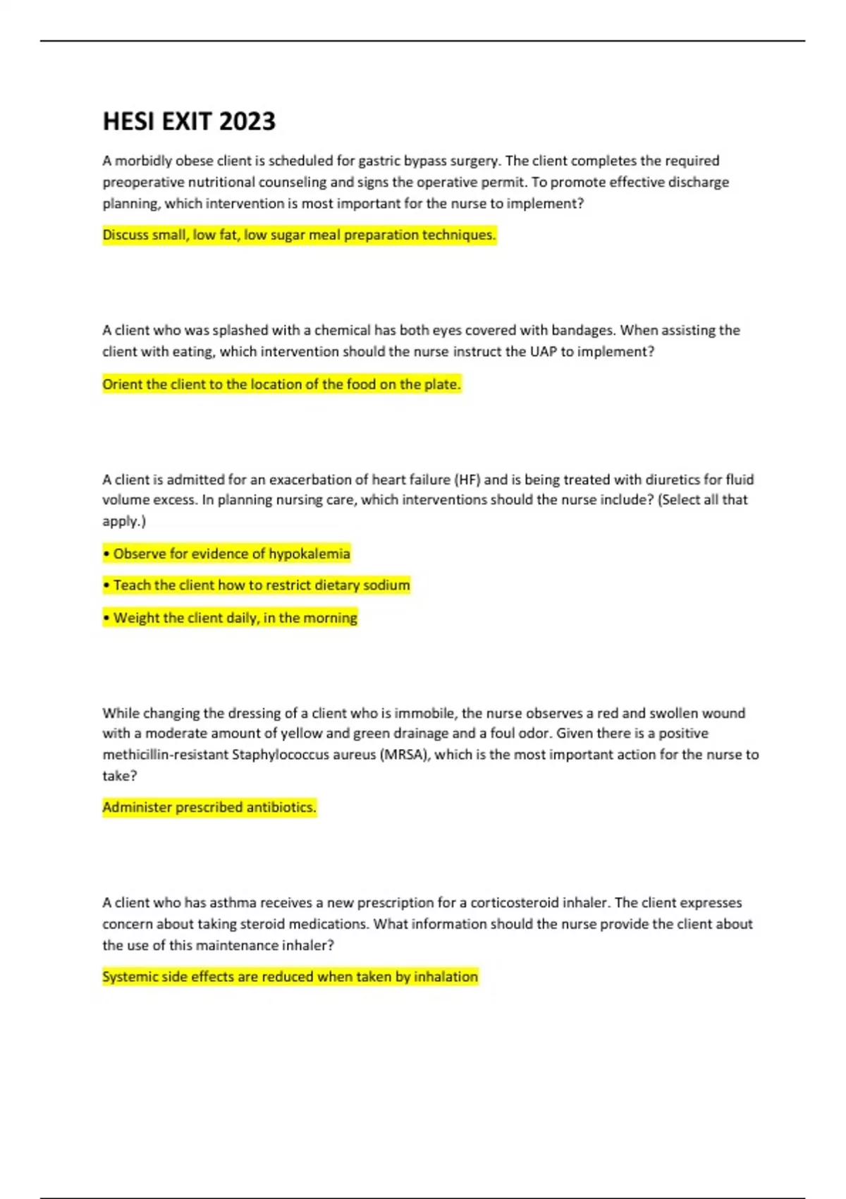 A morbidly obese client is scheduled for gastric bypass surgery. The client completes the required preoperative nutritional counseling and signs the operative permit. To promote effective discharge planning, which intervention is most important for the nurse to implement? Discuss small, low fat, low sugar meal preparation techniques. A client who was splashed with a chemical has both eyes covered with bandages. When assisting the client with eating, which intervention should the nurse instruct the UAP to implement? Orient the client to the location of the food on the plate. A client is admitted for an exacerbation of heart failure (HF) and is being treated with diuretics for fluid volume excess. In planning nursing care, which interventions should the nurse include? (Select all that apply.) • Observe for evidence of hypokalemia • Teach the client how to restrict dietary sodium • Weight the client daily, in the morning