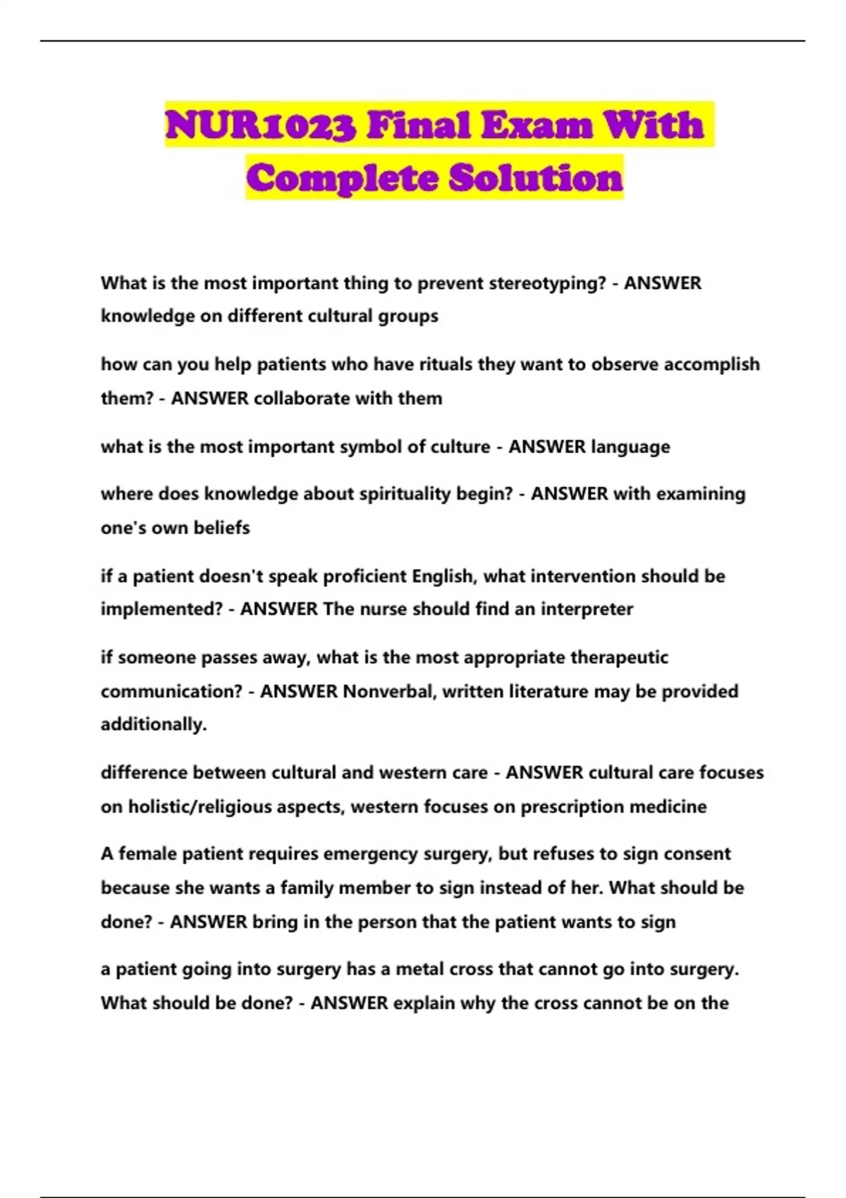 NUR1023 Final Exam With Complete Solution...