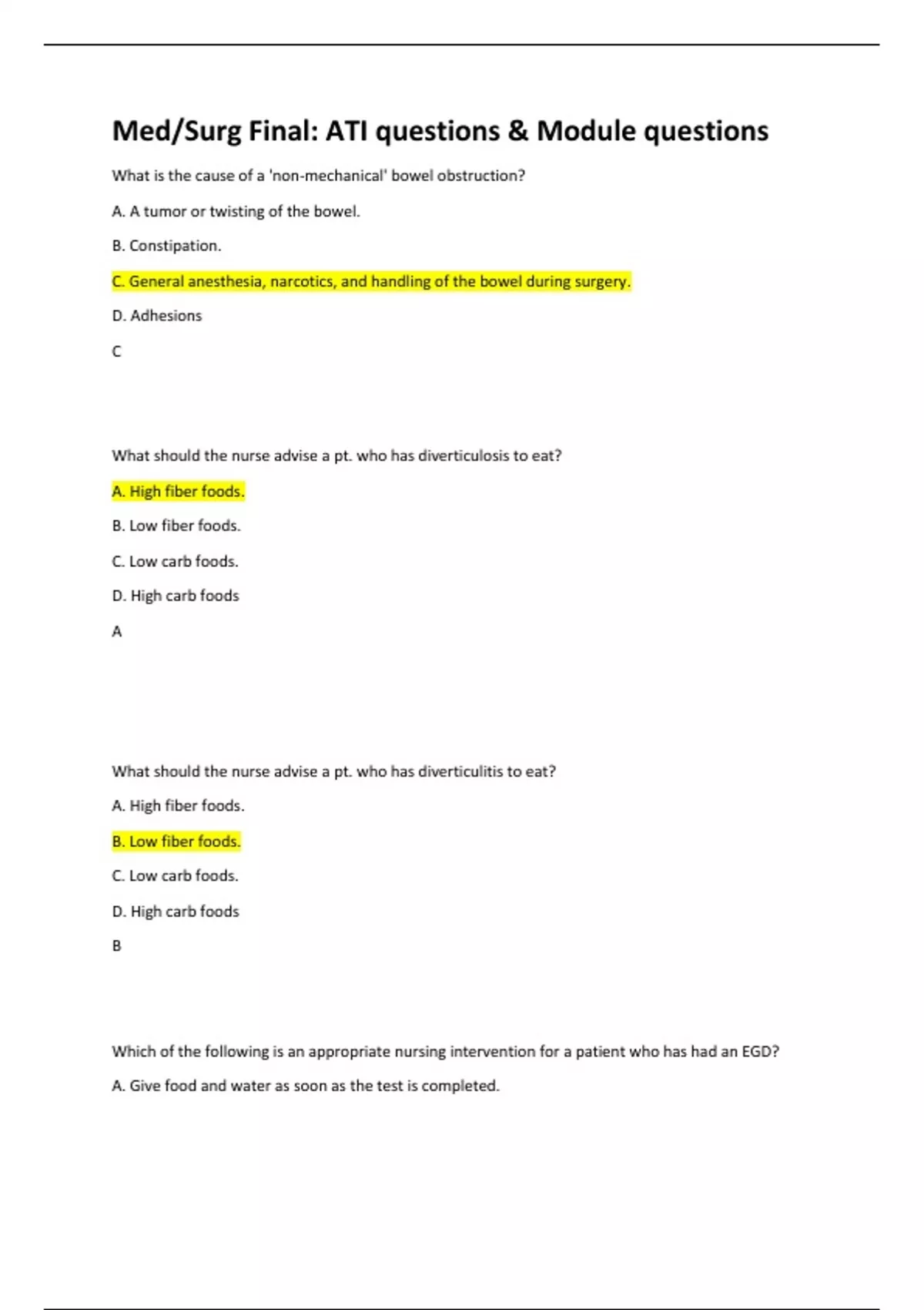 What is the cause of a 'non-mechanical' bowel obstruction? A. A tumor or twisting of the bowel. B. Constipation. C. General anesthesia, narcotics, and handling of the bowel during surgery. D. Adhesions C What should the nurse advise a pt. who has diverticulosis to eat? A. High fiber foods. B. Low fiber foods. C. Low carb foods. D. High carb foods A What should the nurse advise a pt. who has diverticulitis to eat? A. High fiber foods. B. Low fiber foods. C. Low carb foods. D. High carb foods B