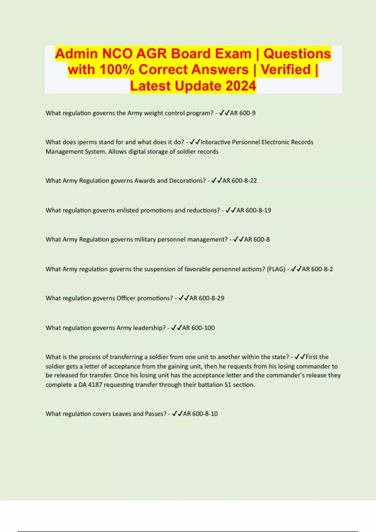 Admin NCO AGR Board Exam | Questions with 100% Correct Answers | Verified | Latest Update 2024