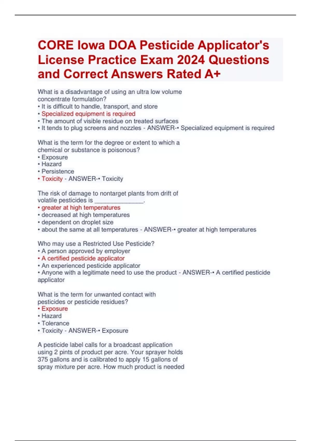 CORE Iowa DOA Pesticide Applicator's License Practice Exam 2024 Questions and Correct Answers Rated A+