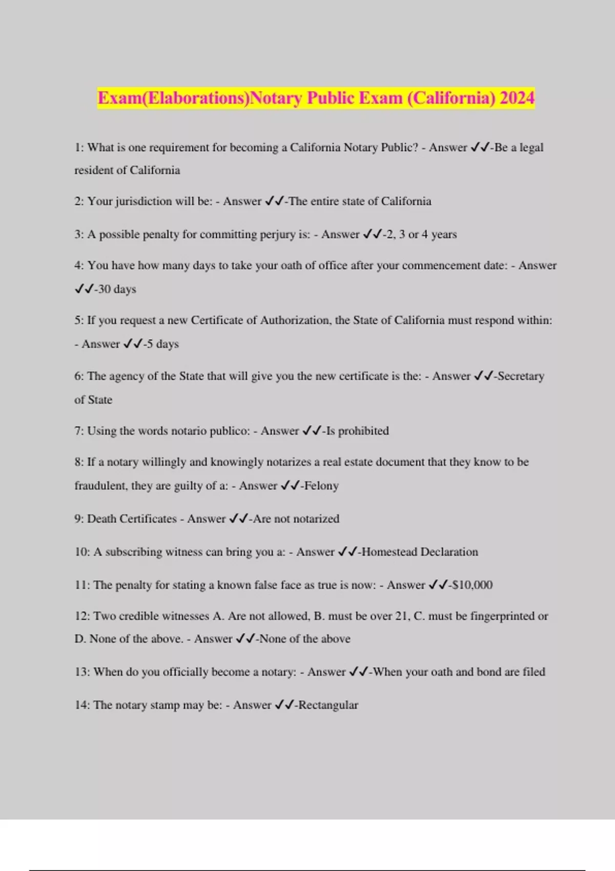 Exam(Elaborations)Notary Public Exam (California) 2024 1: What is one requirement for becoming a California Notary Public? - Answer ️️ -Be a legal resident of California 2: Your jurisdiction will be: - Answer ️️ -The entire state of California 3: A possible penalty for committing perjury is: - Answer ️️ -2, 3 or 4 years 4: You have how many days to take your oath of office after your commencement date: - Answer ️️ -30 days 5: If you request a new Certificate of Authorization, the State of California must respond within: - Answer ️️ -5 days 6: The agency of the State that will give you the new certificate is the: - Answer ️️ -Secretary of State 7: Using the words notario publico: - Answer ️️ -Is prohibited 8: If a notary willingly and knowingly notarizes a real estate document that they know to be fraudulent, they are guilty of a: - Answer ️️ -Felony 9: Death Certificates - Answer ️️ -Are not notarized 10: A subscribing witness can bring you a: - Answer ️️ -Homestead Declaration 11: The penalty for stating a known false face as true is now: - Answer ️️ -$10,000 12: Two credible witnesses A. Are not allowed, B. must be over 21, C. must be fingerprinted or D. None of the above. - Answer ️️ -None of the above 13: When do you officially become a notary: - Answer ️️ -When your oath and bond are filed 14: The notary stamp may be: - Answer ️️ -Rectangula