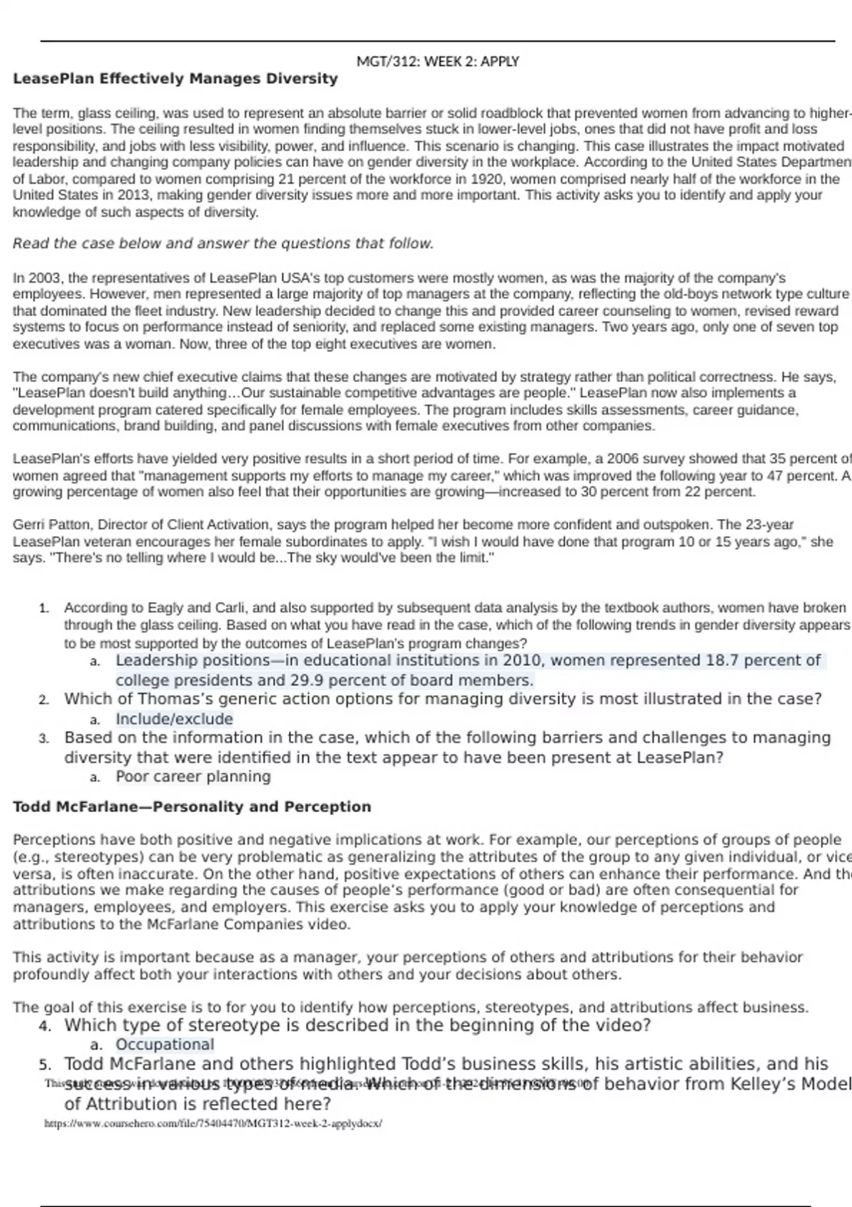 T/312: WEEK 2: APPLY LeasePlan Effectively Manages Diversity The term, glass ceiling, was used to represent an absolute barrier or solid roadblock that prevented women from advancing to higherlevel positions. The ceiling resulted in women finding themselves stuck in lower-level jobs, ones that did not have profit and loss responsibility, and jobs with less visibility, power, and influence. This scenario is changing. This case illustrates the impact motivated leadership and changing company policies can have on gender diversity in the workplace. According to the United States Department of Labor, compared to women comprising 21 percent of the workforce in 1920, women comprised nearly half of the workforce in the United States in 2013, making gender diversity issues more and more important. This activity asks you to identify and apply your knowledge of such aspects of diversity. Read the case below and answer the questions that follow. In 2003, the representatives of LeasePlan USA's top customers were mostly women, as was the majority of the company's employees. However, men represented a large majority of top managers at the company, reflecting the old-boys network type culture that dominated the fleet industry. New leadership decided to change this and provided career counseling to women, revised reward systems to focus on performance instead of seniority, and replaced some existing managers. Two years ago, only one of seven top executives was a woman. Now, three of the top eight executives are women. The company's new chief executive claims that these changes are motivated by strategy rather than political correctness. He says, "LeasePlan doesn't build anything…Our sustainable competitive advantages are people." LeasePlan now also implements a development program catered specifically for female employees. The program includes skills assessments, career guidance, communications, brand building, and panel discussions with female executives from other companies. LeasePlan's efforts have yielded very
