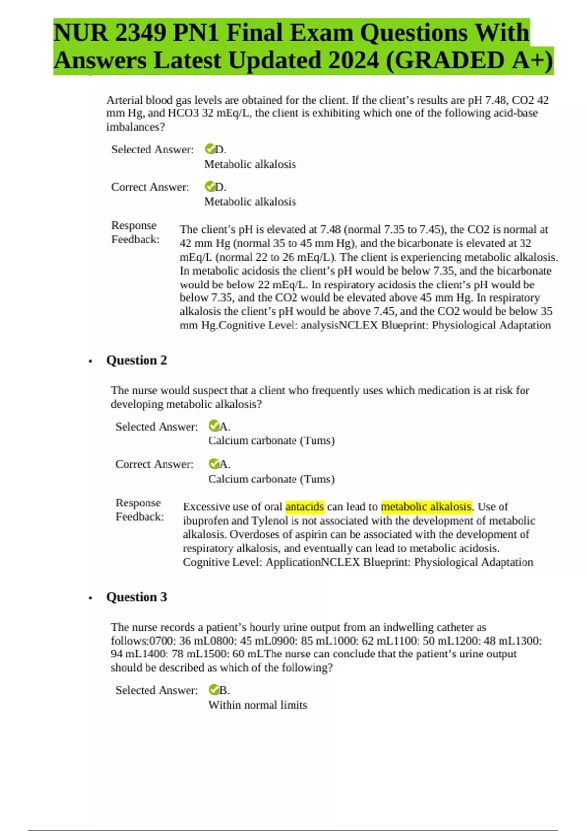 NUR 2349 PN1 Final Exam Questions With Answers Latest Updated 2024 (GRADED A+) Arterial blood gas levels are obtained for the client. If the client’s results are pH 7.48, CO2 42 mm Hg, and HCO3 32 mEq/L, the client is exhibiting which one of the following acid-base imbalances? Selected Answer: D. Metabolic alkalosis Correct Answer: D. Metabolic alkalosis Response Feedback: The client’s pH is elevated at 7.48 (normal 7.35 to 7.45), the CO2 is normal at 42 mm Hg (normal 35 to 45 mm Hg), and the bicarbonate is elevated at 32 mEq/L (normal 22 to 26 mEq/L). The client is experiencing metabolic alkalosis. In metabolic acidosis the client’s pH would be below 7.35, and the bicarbonate would be below 22 mEq/L. In respiratory acidosis the client’s pH would be below 7.35, and the CO2 would be elevated above 45 mm Hg. In respiratory alkalosis the client’s pH would be above 7.45, and the CO2 would be below 35 mm Hg.Cognitive Level: analysisNCLEX Blueprint: Physiological Adaptation • Question 2 The nurse would suspect that a client who frequently uses which medication is at risk for developing metabolic alkalosis? Selected Answer: A. Calcium carbonate (Tums) Correct Answer: A. Calcium carbonate (Tums) Response Feedback: Excessive use of oral antacids can lead to metabolic alkalosis. Use of ibuprofen and Tylenol is not associated with the development of metabolic alkalosis. Overdoses of aspirin can be associated with the development of respiratory alkalosis, and eventually can lead to metabolic acidosis. Cognitive Level: ApplicationNCLEX Blueprint: Physiological Adaptation • Question 3 The nurse records a patient’s hourly urine output from an indwelling catheter as follows:0700: 36 mL0800: 45 mL0900: 85 mL1000: 62 mL1100: 50 mL1200: 48 mL1300: 94 mL1400: 78 mL1500: 60 mLThe nurse can conclude that the patient’s urine output should be described as which of the following? Selected Answer: B. Within normal limits NUR 2349 PN1 Final Exam Questions With Answers Latest Updated 2024 (GRADED A+) Correct Answer: B. Within normal limits Response Feedback: Urine accounts for the greatest amount of fluid loss. Normal urine output for an average-sized adult is approximately 1,500 mL in 24 hr. Urine output varies according to intake and activity but should remain at least 30 to 50 mL per hour. The patient’s urine output is within the normal range. This patient has an indwelling catheter, which will result in continual flow of urine.Cognitive level: analysisNCLEX Blueprint: basic care and comfort • Question 4 A client is admitted with severe diarrhea. Arterial blood gas (ABG) results are pH 7.33; PaCO 2 42; HCO 3 – 20. The nurse concludes this client has which acid–base imbalance? Selected Answer: A. Uncompensated metabolic acidosis Correct Answer: A. Uncompensated metabolic acidosis Response Feedback: The pH and HCO3– are decreased, indicating metabolic acidosis. The PaCO2 is normal, indicating that compensatory mechanisms have not started working. Compensated or uncompensated respiratory acidosis is incorrect because the primary disturbance is metabolic, as indicated by the low bicarbonate level. Compensated metabolic acidosis is incorrect because with compensation, a decrease in PaCO2 to restore balance would be expected. Cognitive Level: AnalyzingNCLEX Blueprint: Physiological Adaptation • Question 5 Identify the appropriate intervention(s) for a patient with hypovolemia. Choose all that apply. B. Monitor I&O daily. C. Encourage fluid intake. D. Monitor electrolyte balance. Correct Answers: B. Monitor I&O daily. C. Encourage fluid intake. Response Feedback: D. Monitor electrolyte balance. Hypovolemia occurs when more fluid is lost than is taken into the body. Monitoring I&O provides information to evaluate the status of the problem. Encouraging fluid intake helps to correct the problem. It is good to monitor electrolytes because electrolyte imbalance can occur with hypovolemia (although it may not occur at first). Deep-breathing techniques do not address fluid balance; there is no evidence that the patient has a respiratory disorder.Cognitive level: ApplicationNCLEX Blueprint: physiological adaptation • Question 6 While caring for a patient preparing for a kidney transplant, the nurse knows that the patient understands teaching on immunosuppression when she states which of the following? Selected Answer: Correct Answer: Response Feedback: C. "The medications that I take will help prevent my body from attacking my new kidney." C. "The medications that I take will help prevent my body from attacking my new kidney." Immunosuppressant therapy is initiated to inhibit optimal immune response. This is necessary in the case of transplantation, because the normal immune response would cause the body to recognize the new tissue as foreign and attack it. The body will identify the new kidney as foreign and will not treat it as the original kidney. While patients with transplants must be careful about exposure to others, especially those who are or might be ill, and practice adequate and consistent infection control techniques, they don't have to avoid people or social interaction. The new kidney brings foreign cells regardless of relationship between donor and recipient.Cognitive Level: ApplicationNCLEX Blueprint: Health promotion and Maintenance • Question 7 The nurse assessed four patients at the beginning of the shift. Which finding should the nurse report most urgently to the physician? Selected Answer: A. Swollen ankles in patient with compensated heart failure Correct Answer: B. Positive Chvostek's sign in patient with acute pancreatitis Response Feedback: Positive Chvostek's sign indicates increased neuromuscular excitability, which can progress to dangerous laryngospasm or seizures and thus needs to be reported first. The other assessment findings are less urgent and need further assessment. Bilateral ankle edema is a sign of ECV excess, and follow-up is needed, but the situation is