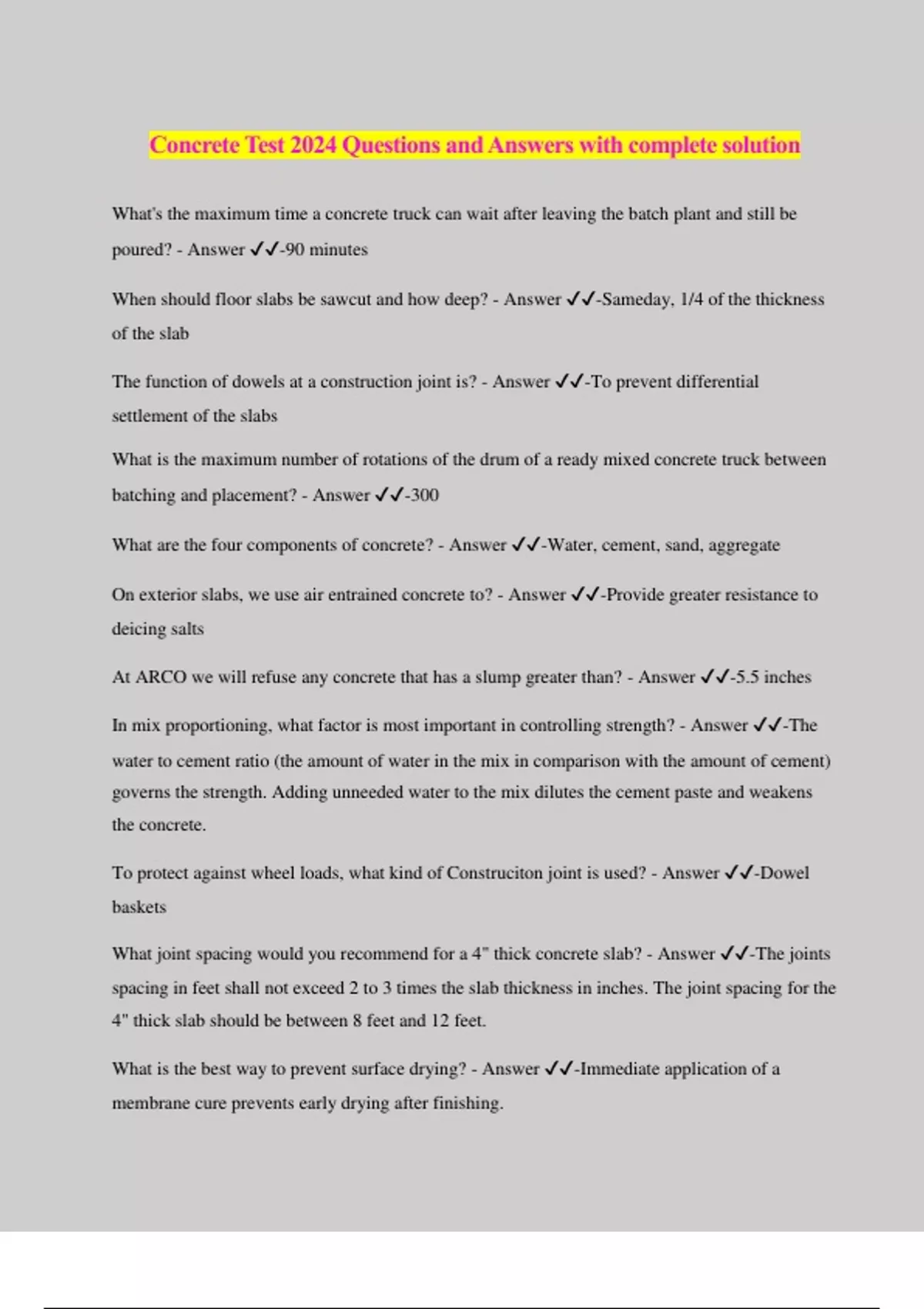 Concrete Test 2024 Questions and Answers with complete solution What's the maximum time a concrete truck can wait after leaving the batch plant and still be poured? - Answer ️️ -90 minutes When should floor slabs be sawcut and how deep? - Answer ️️ -Sameday, 1/4 of the thickness of the slab The function of dowels at a construction joint is? - Answer ️️ -To prevent differential settlement of the slabs What is the maximum number of rotations of the drum of a ready mixed concrete truck between batching and placement? - Answer ️️ -300 What are the four components of concrete? - Answer ️️ -Water, cement, sand, aggregate On exterior slabs, we use air entrained concrete to? - Answer ️️ -Provide greater resistance to deicing salts At ARCO we will refuse any concrete that has a slump greater than? - Answer ️️ -5.5 inches In mix proportioning, what factor is most important in controlling strength? - Answer ️️ -The water to cement ratio (the amount of water in the mix in comparison with the amount of cement) governs the strength. Adding unneeded water to the mix dilutes the cement paste and weakens the concrete. To protect against wheel loads, what kind of Construciton joint is used? - Answer ️️ -Dowel baskets What joint spacing would you recommend for a 4" thick concrete slab? - Answer ️️ -The joints spacing in feet shall not exceed 2 to 3 times the slab thickness in inches. The joint spacing for the 4" thick slab should be between 8 feet and 12 feet. What is the best way to prevent surface drying? - Answer ️️ -Immediate application of a membrane cure prevents early drying after finishing. Which of the materials in the mix affects concrete temperature the most? - Answer ️️ -The aggregate has the greatest effect on concrete temperature, water is next, and cement has the least the effect. How many tons does an 8.5" thick tilt wall panel weigh that is 28' tall and 15' wide? - Answer ️️ -(8.5/12)(28')(15')(150lbs/CF) all divided by 2,000 = 22.3 A sack of cement weighs? - Answer ️️ -94 LBS. The maximum number of gallons per sack of cement that we specify is? - Answer ️️ -6 gallons Adding one gallon of water to a cubic yard of concrete will? - Answer ️️ -Increase the slump approximately 1", increases the shrinkage potential about 10%, increase the possibility of seepage through the concrete by 50%. What percentage of concrete's ultimat