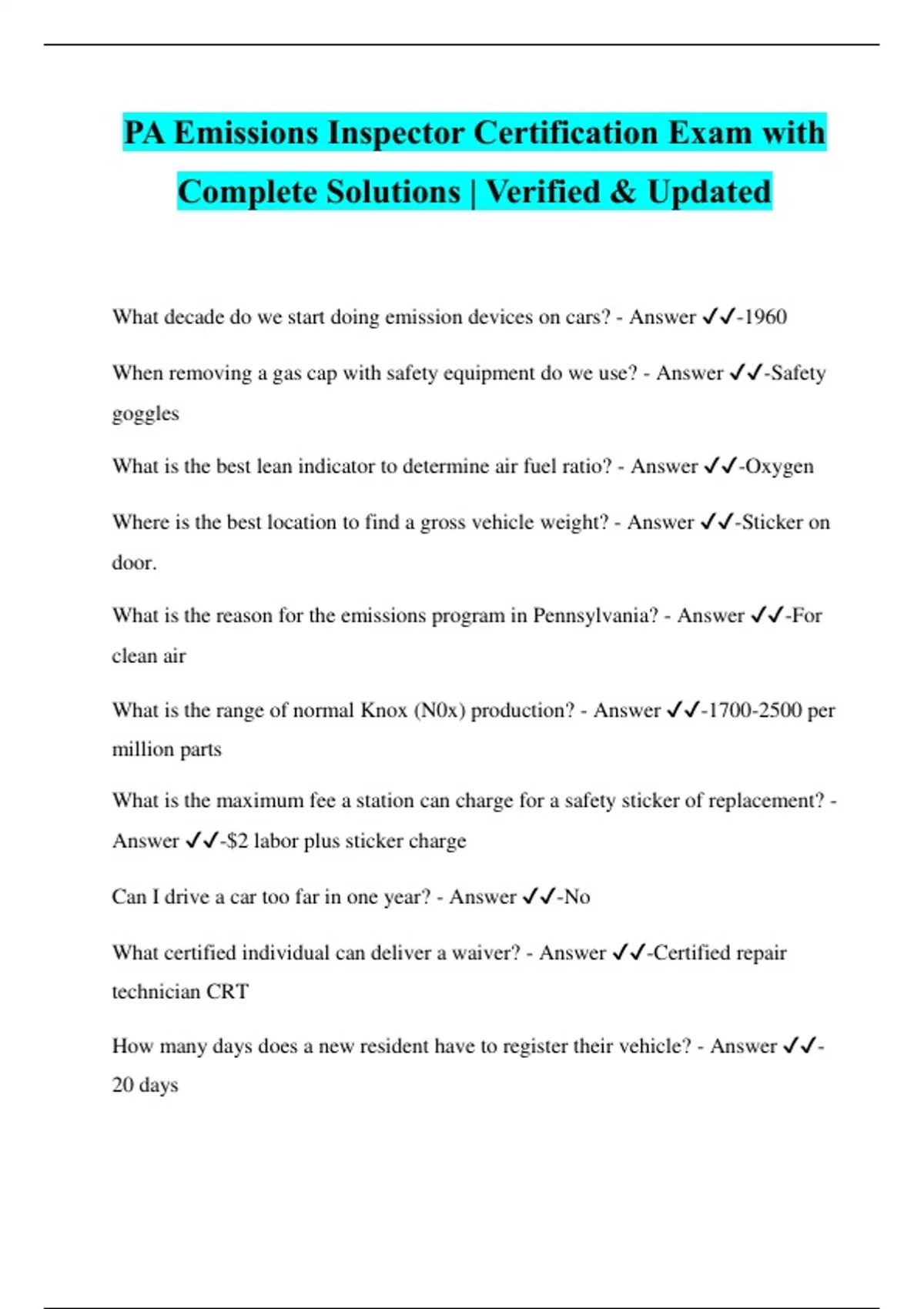 PA Emissions Inspector Certification Exam with Complete Solutions | Verified & Updated