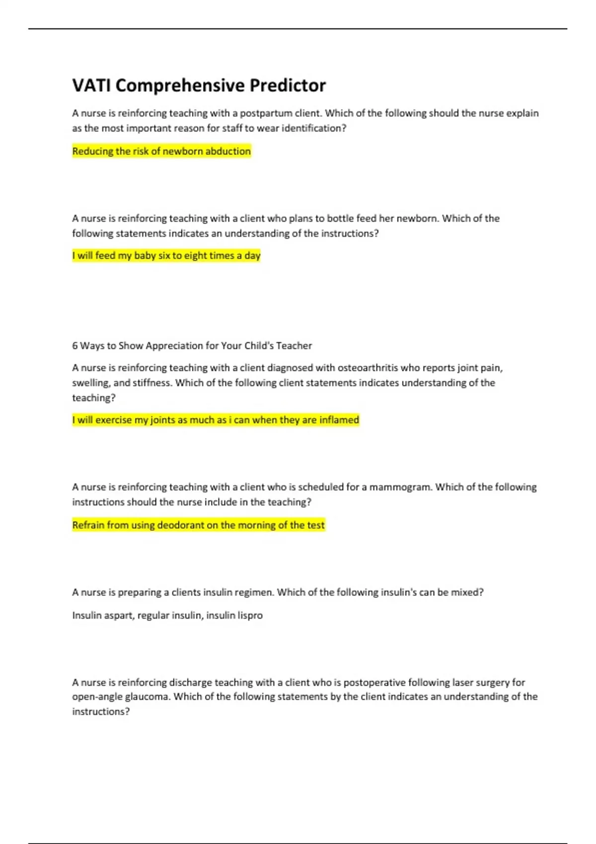 A nurse is reinforcing teaching with a postpartum client. Which of the following should the nurse explain as the most important reason for staff to wear identification? Reducing the risk of newborn abduction A nurse is reinforcing teaching with a client who plans to bottle feed her newborn. Which of the following statements indicates an understanding of the instructions? I will feed my baby six to eight times a day 6 Ways to Show Appreciation for Your Child's Teacher A nurse is reinforcing teaching with a client diagnosed with osteoarthritis who reports joint pain, swelling, and stiffness. Which of the following client statements indicates understanding of the teaching? I will exercise my joints as much as i can when they are inflamed