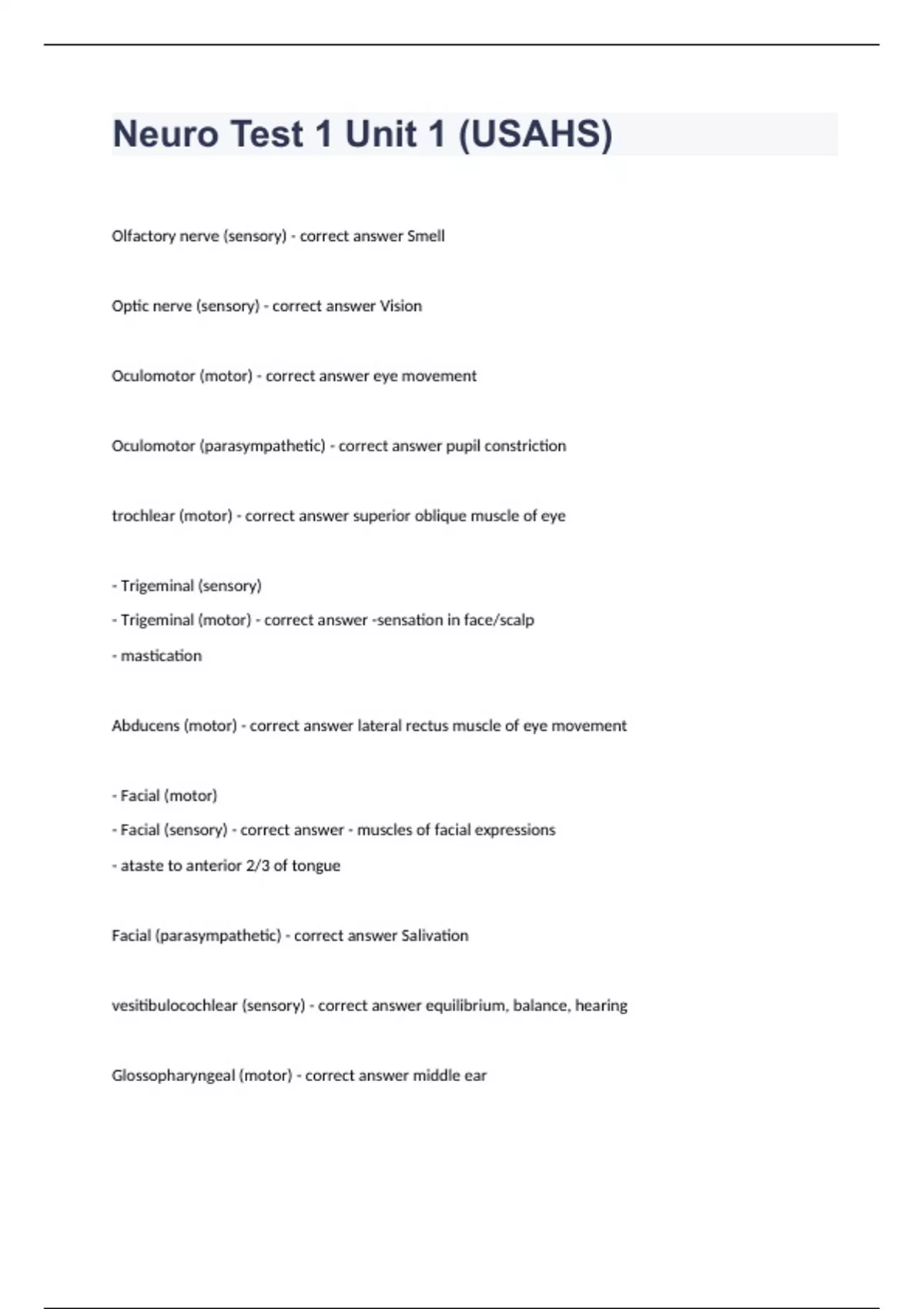 Neuro Test 1 Unit 1 (USAHS)Olfactory nerve (sensory) - correct answer Smell Optic nerve (sensory) - correct answer Vision Oculomotor (motor) - correct answer eye movement Oculomotor (parasympathetic) - correct answer pupil constriction trochlear (motor) - correct answer superior oblique muscle of eye - Trigeminal (sensory) - Trigeminal (motor) - correct answer -sensation in face/scalp - mastication Abducens (motor) - correct answer lateral rectus muscle of eye movement - Facial (motor) - Facial (sensory) - correct answer - muscles of facial expressions - ataste to anterior 2/3 of tongue Facial (parasympathetic) - correct answer Salivation vesitibulocochlear (sensory) - correct answer equilibrium, balance, hearing Glossopharyngeal (motor) - correct answer middle ear Glossopharyngeal (sensory) - correct answer posterior 1/3 of tongue and pharynx Glossopharyngeal (parasympathetic) - correct answer Salivation Vagus (motor) - correct answer Speech, swallow Vagus (Sensory) - correct answer taste, sensation to the pharynx, larynx, trachia, and bronchioles Vagus (parasympathetic) - correct answer External ear Accessory (motor) - correct answer movement of head and shoulders Hypoglossal (motor) - correct answer muscles of the tongue Test olfactory nerve? - correct answer Offer them something to smell Test optic nerve? (acuity) - correct answer Snellen chart Test optic nerve (color)? - correct answer Ishihara plates Optic nerve (visual field)? - correct answer clinician wiggle fingers in quadrants Optic Nerve (visual attention)? - correct answer wiggling both fingers ask which is wiggling Optic nerve (visual reflex)? - correct answer shine light into pupils to see if they constrict Test oculomotor nerve? - correct answer draw large H's with finger make patients follow with eyes