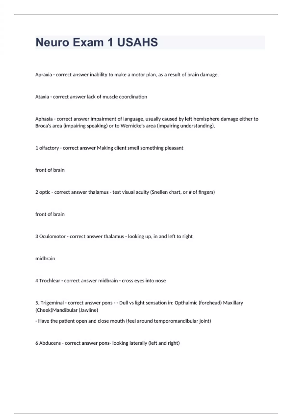 Neuro Exam 1 USAHSApraxia - correct answer inability to make a motor plan, as a result of brain damage. Ataxia - correct answer lack of muscle coordination Aphasia - correct answer impairment of language, usually caused by left hemisphere damage either to Broca's area (impairing speaking) or to Wernicke's area (impairing understanding). 1 olfactory - correct answer Making client smell something pleasant front of brain 2 optic - correct answer thalamus - test visual acuity (Snellen chart, or # of fingers) front of brain 3 Oculomotor - correct answer thalamus - looking up, in and left to right midbrain 4 Trochlear - correct answer midbrain - cross eyes into nose 5. Trigeminal - correct answer pons - - Dull vs light sensation in: Opthalmic (forehead) Maxillary (Cheek)Mandibular (Jawline) - Have the patient open and close mouth (feel around temporomandibular joint) 6 Abducens - correct answer pons- looking laterally (left and right)