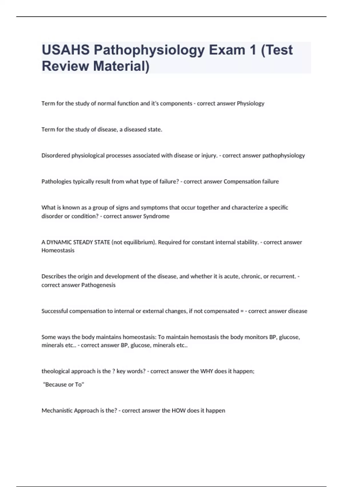 USAHS Pathophysiology Exam 1 (Test Review Material)Term for the study of normal function and it's components - correct answer Physiology Term for the study of disease, a diseased state. Disordered physiological processes associated with disease or injury. - correct answer pathophysiology Pathologies typically result from what type of failure? - correct answer Compensation failure What is known as a group of signs and symptoms that occur together and characterize a specific disorder or condition? - correct answer Syndrome A DYNAMIC STEADY STATE (not equilibrium). Required for constant internal stability. - correct answer Homeostasis Describes the origin and development of the disease, and whether it is acute, chronic, or recurrent. - correct answer Pathogenesis Successful compensation to internal or external changes, if not compensated = - correct answer disease Some ways the body maintains homeostasis: To maintain hemostasis the body monitors BP, glucose, minerals etc.. - correct answer BP, glucose, minerals etc.. theological approach is the ? key words? - correct answer the WHY does it happen; "Because or To" Mechanistic Approach is the? - correct answer the HOW does it happen