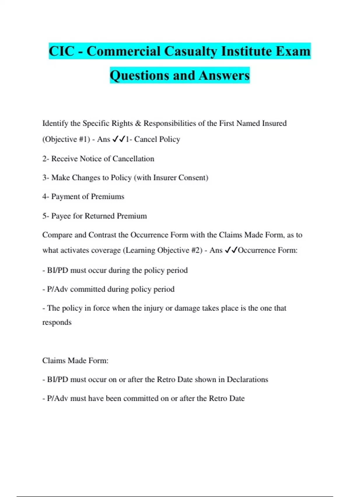 CIC - Commercial Casualty Institute Exam Questions and Answers