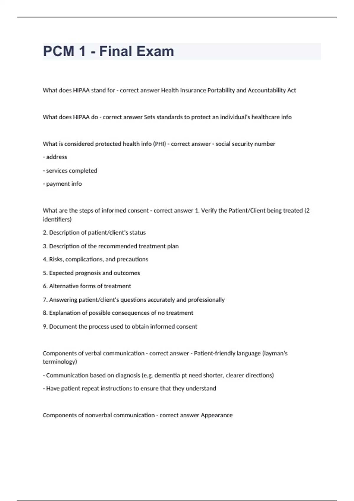 PCM 1 - Final ExamWhat does HIPAA stand for - correct answer Health Insurance Portability and Accountability Act What does HIPAA do - correct answer Sets standards to protect an individual's healthcare info What is considered protected health info (PHI) - correct answer - social security number - address - services completed - payment info What are the steps of informed consent - correct answer 1. Verify the Patient/Client being treated (2 identifiers) 2. Description of patient/client's status 3. Description of the recommended treatment plan 4. Risks, complications, and precautions 5. Expected prognosis and outcomes 6. Alternative forms of treatment 7. Answering patient/client's questions accurately and professionally 8. Explanation of possible consequences of no treatment 9. Document the process used to obtain informed consent Components of verbal communication - correct answer - Patient-friendly language (layman's terminology) - Communication based on diagnosis (e.g. dementia pt need shorter, clearer directions) - Have patient repeat instructions to ensure that they understand Components of nonverbal communication - correct answer Appearance
