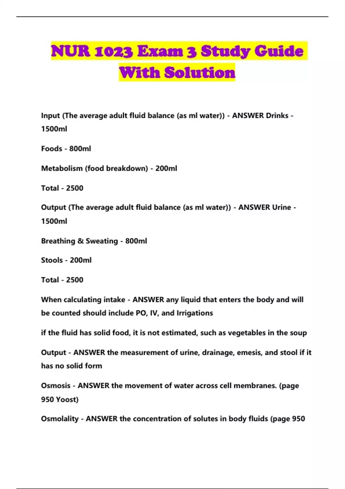 NUR 1023 Exam 3 Study Guide With Solution