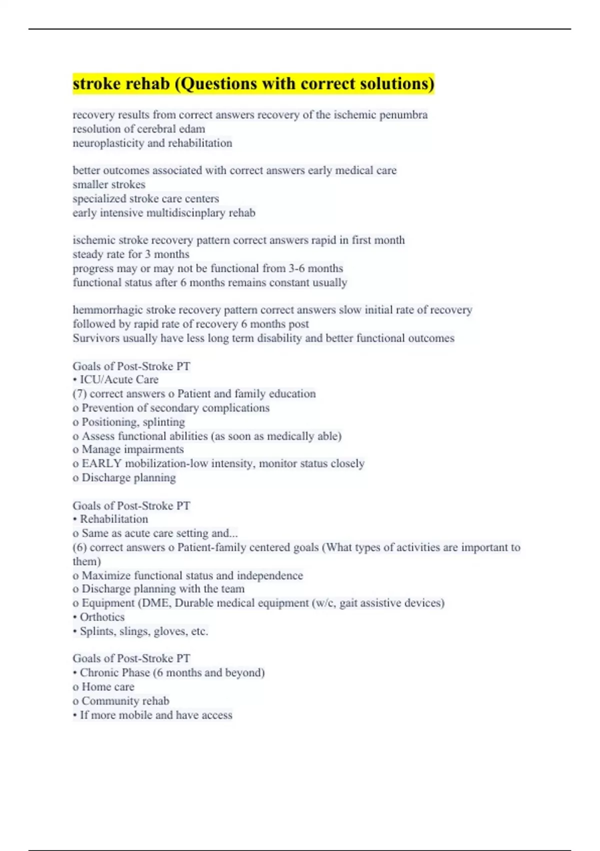 recovery results from correct answers recovery of the ischemic penumbra resolution of cerebral edam neuroplasticity and rehabilitation better outcomes associated with correct answers early medical care smaller strokes specialized stroke care centers early intensive multidiscinplary rehab ischemic stroke recovery pattern correct answers rapid in first month steady rate for 3 months progress may or may not be functional from 3-6 months functional status after 6 months remains constant usually hemmorrhagic stroke recovery pattern correct answers slow initial rate of recovery followed by rapid rate of recovery 6 months post Survivors usually have less long term disability and better functional outcomes Goals of Post-Stroke PT • ICU/Acute Care (7) correct answers o Patient and family education o Prevention of secondary complications o Positioning, splinting o Assess functional abilities (as soon as medically able) o Manage impairments o EARLY mobilization-low intensity, monitor status closely o Discharge planning Goals of Post-Stroke PT • Rehabilitation o Same as acute care setting and... (6) correct answers o Patient-family centered goals (What types of activities are important to them) o Maximize functional status and independence o Discharge planning with the team o Equipment (DME, Durable medical equipment (w/c, gait assistive devices) • Orthotics • Splints, slings, gloves, etc. Goals of Post-Stroke PT • Chronic Phase (6 months and beyond) o Home care o Community rehab • If more mobile and have access