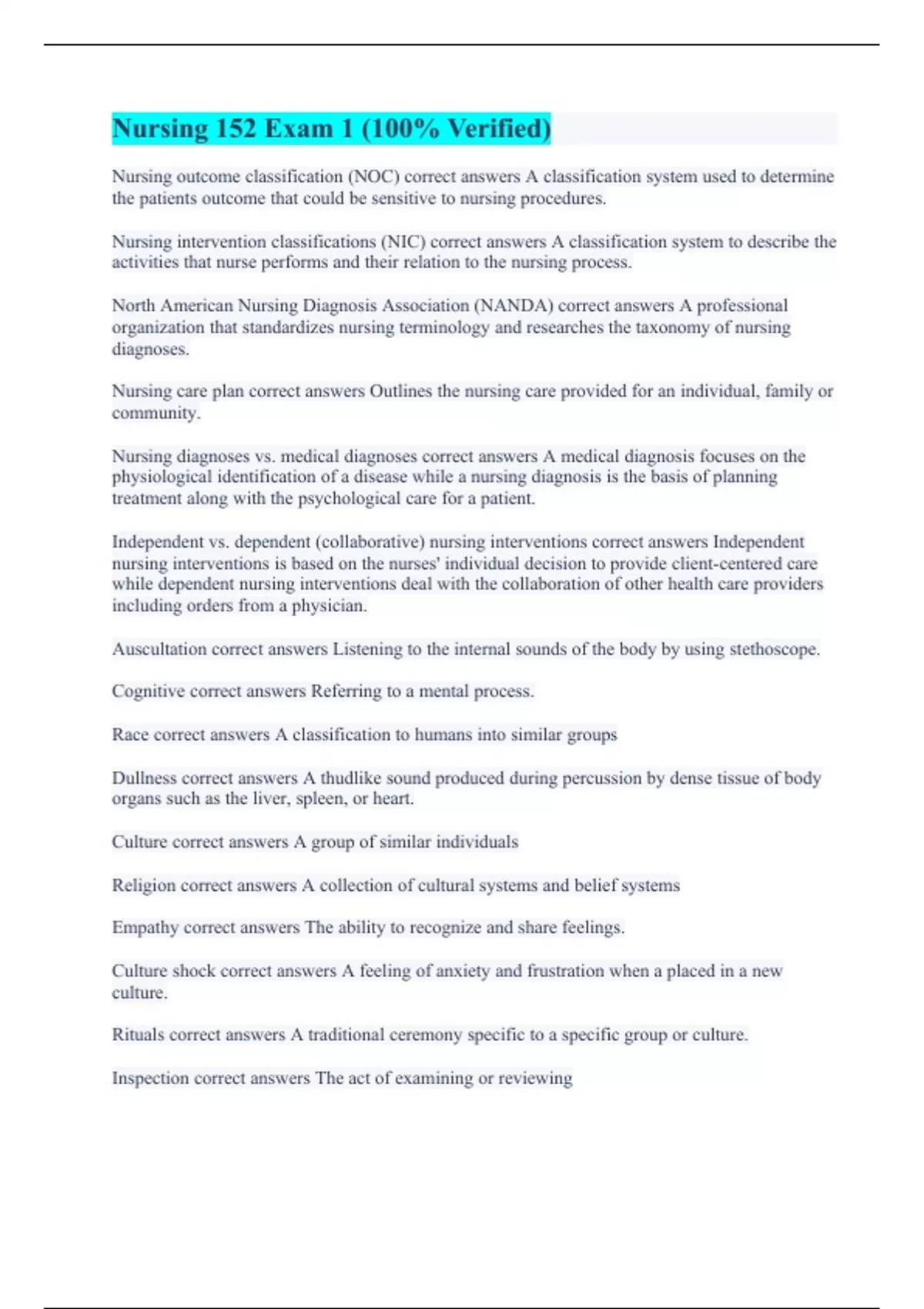 Nursing outcome classification (NOC) correct answers A classification system used to determine the patients outcome that could be sensitive to nursing procedures. Nursing intervention classifications (NIC) correct answers A classification system to describe the activities that nurse performs and their relation to the nursing process. North American Nursing Diagnosis Association (NANDA) correct answers A professional organization that standardizes nursing terminology and researches the taxonomy of nursing diagnoses. Nursing care plan correct answers Outlines the nursing care provided for an individual, family or community. Nursing diagnoses vs. medical diagnoses correct answers A medical diagnosis focuses on the physiological identification of a disease while a nursing diagnosis is the basis of planning treatment along with the psychological care for a patient. Independent vs. dependent (collaborative) nursing interventions correct answers Independent nursing interventions is based on the nurses' individual decision to provide client-centered care while dependent nursing interventions deal with the collaboration of other health care providers including orders from a physician. Auscultation correct answers Listening to the internal sounds of the body by using stethoscope. Cognitive correct answers Referring to a mental process. Race correct answers A classification to humans into similar groups Dullness correct answers A thudlike sound produced during percussion by dense tissue of body organs such as the liver, spleen, or heart. Culture correct answers A group of similar individuals Religion correct answers A collection of cultural systems and belief systems Empathy correct answers The ability to recognize and share feelings. Culture shock correct answers A feeling of anxiety and frustration when a placed in a new culture. Rituals correct answers A traditional ceremony specific to a specific group or culture. Inspection correct answers The act of examining or reviewing