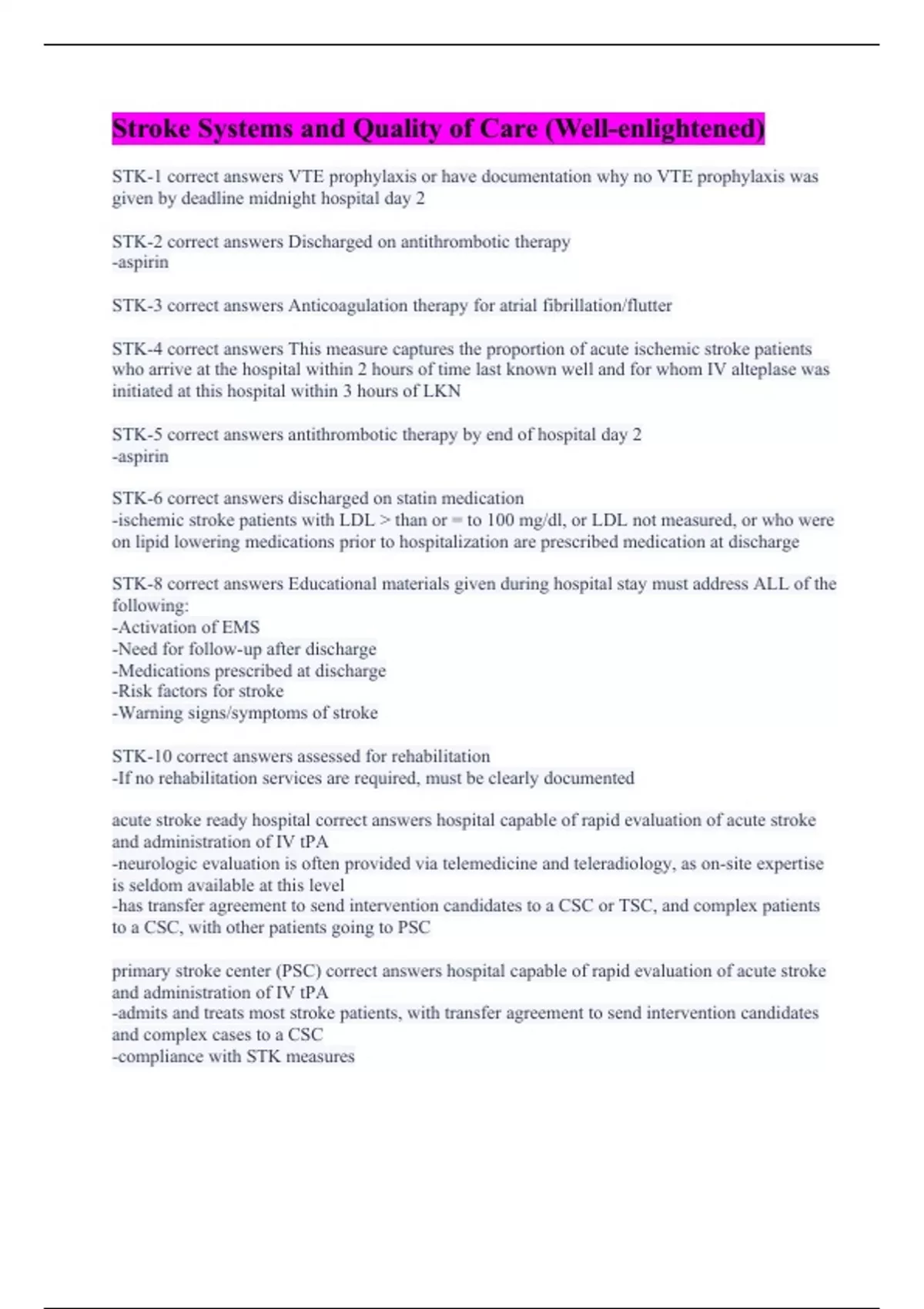 STK-1 correct answers VTE prophylaxis or have documentation why no VTE prophylaxis was given by deadline midnight hospital day 2 STK-2 correct answers Discharged on antithrombotic therapy -aspirin STK-3 correct answers Anticoagulation therapy for atrial fibrillation/flutter STK-4 correct answers This measure captures the proportion of acute ischemic stroke patients who arrive at the hospital within 2 hours of time last known well and for whom IV alteplase was initiated at this hospital within 3 hours of LKN STK-5 correct answers antithrombotic therapy by end of hospital day 2 -aspirin STK-6 correct answers discharged on statin medication -ischemic stroke patients with LDL > than or = to 100 mg/dl, or LDL not measured, or who were on lipid lowering medications prior to hospitalization are prescribed medication at discharge STK-8 correct answers Educational materials given during hospital stay must address ALL of the following: -Activation of EMS -Need for follow-up after discharge -Medications prescribed at discharge -Risk factors for stroke -Warning signs/symptoms of stroke STK-10 correct answers assessed for rehabilitation -If no rehabilitation services are required, must be clearly documented acute stroke ready hospital correct answers hospital capable of rapid evaluation of acute stroke and administration of IV tPA -neurologic evaluation is often provided via telemedicine and teleradiology, as on-site expertise is seldom available at this level -has transfer agreement to send intervention candidates to a CSC or TSC, and complex patients to a CSC, with other patients going to PSC primary stroke center (PSC) correct answers hospital capable of rapid evaluation of acute stroke and administration of IV tPA -admits and treats most stroke patients, with transfer agreement to send intervention candidates and complex cases to a CSC -compliance with STK measures