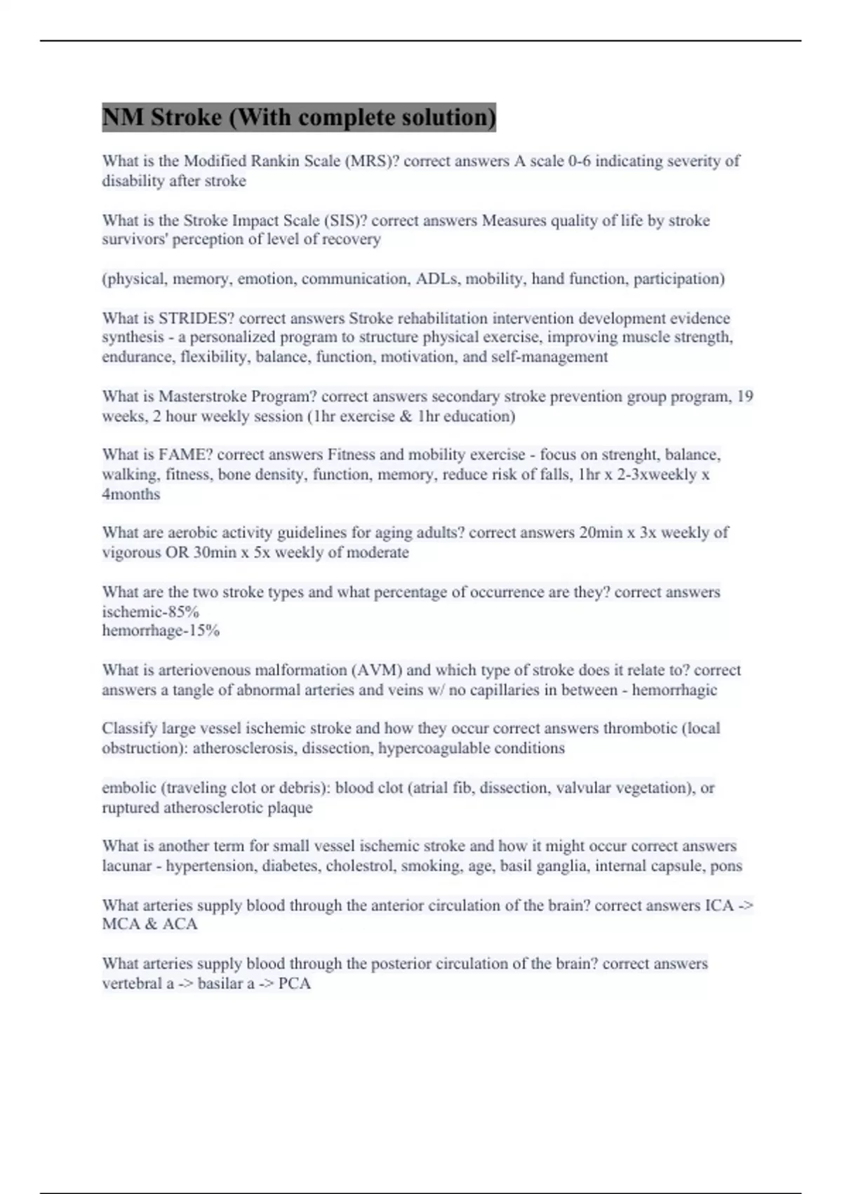 What is the Modified Rankin Scale (MRS)? correct answers A scale 0-6 indicating severity of disability after stroke What is the Stroke Impact Scale (SIS)? correct answers Measures quality of life by stroke survivors' perception of level of recovery (physical, memory, emotion, communication, ADLs, mobility, hand function, participation) What is STRIDES? correct answers Stroke rehabilitation intervention development evidence synthesis - a personalized program to structure physical exercise, improving muscle strength, endurance, flexibility, balance, function, motivation, and self-management What is Masterstroke Program? correct answers secondary stroke prevention group program, 19 weeks, 2 hour weekly session (1hr exercise & 1hr education) What is FAME? correct answers Fitness and mobility exercise - focus on strenght, balance, walking, fitness, bone density, function, memory, reduce risk of falls, 1hr x 2-3xweekly x 4months What are aerobic activity guidelines for aging adults? correct answers 20min x 3x weekly of vigorous OR 30min x 5x weekly of moderate What are the two stroke types and what percentage of occurrence are they? correct answers ischemic-85% hemorrhage-15% What is arteriovenous malformation (AVM) and which type of stroke does it relate to? correct answers a tangle of abnormal arteries and veins w/ no capillaries in between - hemorrhagic Classify large vessel ischemic stroke and how they occur correct answers thrombotic (local obstruction): atherosclerosis, dissection, hypercoagulable conditions embolic (traveling clot or debris): blood clot (atrial fib, dissection, valvular vegetation), or ruptured atherosclerotic plaque What is another term for small vessel ischemic stroke and how it might occur correct answers lacunar - hypertension, diabetes, cholestrol, smoking, age, basil ganglia, internal capsule, pons What arteries supply blood through the anterior circulation of the brain? correct answers ICA -> MCA & ACA What arteries supply blood through the posterior circulation of the brain? correct answers vertebral a -> basilar a -> PCA