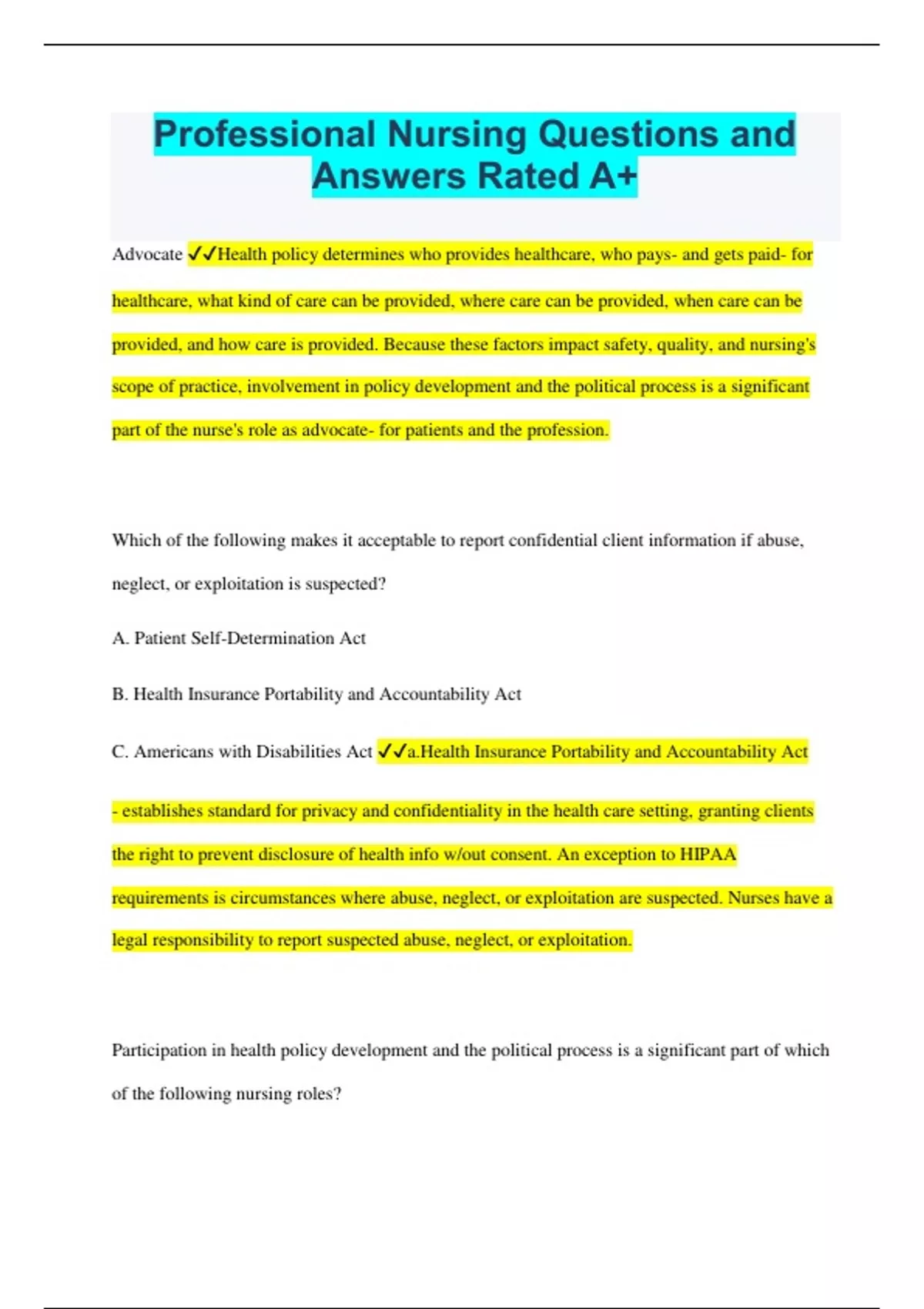 Professional Nursing Questions and Answers Rated A+ Advocate Health policy determines who provides healthcare, who pays- and gets paid- for healthcare, what kind of care can be provided, where care can be provided, when care can be provided, and how care is provided. Because these factors impact safety, quality, and nursing's scope of practice, involvement in policy development and the political process is a significant part of the nurse's role as advocate- for patients and the profession. Which of the following makes it acceptable to report confidential client information if abuse, neglect, or exploitation is suspected? A. Patient Self-Determination Act B. Health Insurance Portability and Accountability Act C. Americans with Disabilities Act a.Health Insurance Portability and Accountability Act - establishes standard for privacy and confidentiality in the health care setting, granting clients the right to prevent disclosure of health info w/out consent. An exception to HIPAA requirements is circumstances where abuse, neglect, or exploitation are suspected. Nurses have a legal responsibility to report suspected abuse, neglect, or exploitation. Participation in health policy development and the political process is a significant part of which of the following nursing roles? A. Manager B. Collaborator C. Advocate A. Advocate Which of the following is an example of an unintentional tort? A. False imprisonment B. Battery C. Negligence C. Negligence When obtaining written consent for a procedure to be preformed by someone else, the nurse's signature confirms which of the following? (Select all that apply) A. The client appears competent to agree to the procedure B. The client understands the risks of the procedure C. The client has been notified of alternatives to the procedure D. The client consents voluntarily to the procedure E. The family supports the client's decision to have the procedure A, D A- Nurse's signature confirms that the client appears competent to agree to the procedure D- Nurse's signature confirms that the client voluntarily consents to the procedure Incorrect: B- risks of procedure explained by the provider who is performing the procedure C-alternatives to the procedure are the responsibility of the provider who is performing the procedure to inform the patient E- as long as the client is a legal, competent adult, family agreement is not a consideration A nurse is telling the truth, keeping promises, and doing no harm while caring for a client who is experiencing conflict with his family. Which of the following is the nurse demonstrating? A. Honoring client autonomy B. Primary commitment to the client C. Accountability for professional practice B- Primary commitment to the client When conflicts of interest arise, demonstrating a primary commitment to the client involves the ethical principles of veracity(telling the truth), fidelity(keeping your promises), and non-maleficence(doing no harm). Abiding by these principles demonstrates courage and ensures professional integrity. Which of the following actions represents the professional value of altruism? A. A nurse mentoring a colleague in professional growth B. A nurse respecting a client's decision to refuse treatment C. A nurse encouraging a clinic to treat a homeless man who is unable to pay for his care A- Altruism is concern for the well-being of others. One way nurses demonstrate altruism is through unselfish support of others, especially mentoring colleagues in their professional growth Incorrect: B- nurses demonstrate a respect for autonomy by respecting a client's decision to refuse treatment C- nurses demonstrate the value of social justice when supporting the right of all patients to have access to health care without discrimination A nurse acting to accomplish goals in an efficient manner with other people is fulfilling which of the following roles? A. Change agent B. Manager C. Educator B. Manager Incorrect: A- change agent identifies probs in health care delivery affecting client care, safety, access to care, or to work enviro C- educator assists clients in recognizing choices, evaluating alternatives , and developing sense of control over enviro and health
