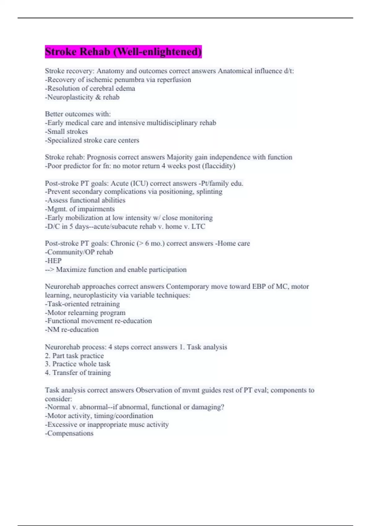 Stroke recovery: Anatomy and outcomes correct answers Anatomical influence d/t: -Recovery of ischemic penumbra via reperfusion -Resolution of cerebral edema -Neuroplasticity & rehab Better outcomes with: -Early medical care and intensive multidisciplinary rehab -Small strokes -Specialized stroke care centers Stroke rehab: Prognosis correct answers Majority gain independence with function -Poor predictor for fn: no motor return 4 weeks post (flaccidity) Post-stroke PT goals: Acute (ICU) correct answers -Pt/family edu. -Prevent secondary complications via positioning, splinting -Assess functional abilities -Mgmt. of impairments -Early mobilization at low intensity w/ close monitoring -D/C in 5 days--acute/subacute rehab v. home v. LTC Post-stroke PT goals: Chronic (> 6 mo.) correct answers -Home care -Community/OP rehab -HEP --> Maximize function and enable participation Neurorehab approaches correct answers Contemporary move toward EBP of MC, motor learning, neuroplasticity via variable techniques: -Task-oriented retraining -Motor relearning program -Functional movement re-education -NM re-education Neurorehab process: 4 steps correct answers 1. Task analysis 2. Part task practice 3. Practice whole task 4. Transfer of training Task analysis correct answers Observation of mvmt guides rest of PT eval; components to consider: -Normal v. abnormal--if abnormal, functional or damaging? -Motor activity, timing/coordination -Excessive or inappropriate musc activity -Compensations correct answers Anatomical influence d/t: -Recovery of ischemic penumbra via reperfusion -Resolution of cerebral edema -Neuroplasticity & rehab Better outcomes with: -Early medical care and intensive multidisciplinary rehab -Small strokes -Specialized stroke care centers Stroke rehab: Prognosis correct answers Majority gain independence with function -Poor predictor for fn: no motor return 4 weeks post (flaccidity) Post-stroke PT goals: Acute (ICU) correct answers -Pt/family edu. -Prevent secondary complications via positioning, splinting -Assess functional abilities -Mgmt. of impairments -Early mobilization at low intensity w/ close monitoring -D/C in 5 days--acute/subacute rehab v. home v. LTC Post-stroke PT goals: Chronic (> 6 mo.) correct answers -Home care -Community/OP rehab -HEP --> Maximize function and enable participation Neurorehab approaches correct answers Contemporary move toward EBP of MC, motor learning, neuroplasticity via variable techniques: -Task-oriented retraining -Motor relearning program -Functional movement re-education -NM re-education Neurorehab process: 4 steps correct answers 1. Task analysis 2. Part task practice 3. Practice whole task 4. Transfer of training Task analysis correct answers Observation of mvmt guides rest of PT eval; components to consider: -Normal v. abnormal--if abnormal, functional or damaging? -Motor activity, timing/coordination -Excessive or inappropriate musc activity -Compensations
