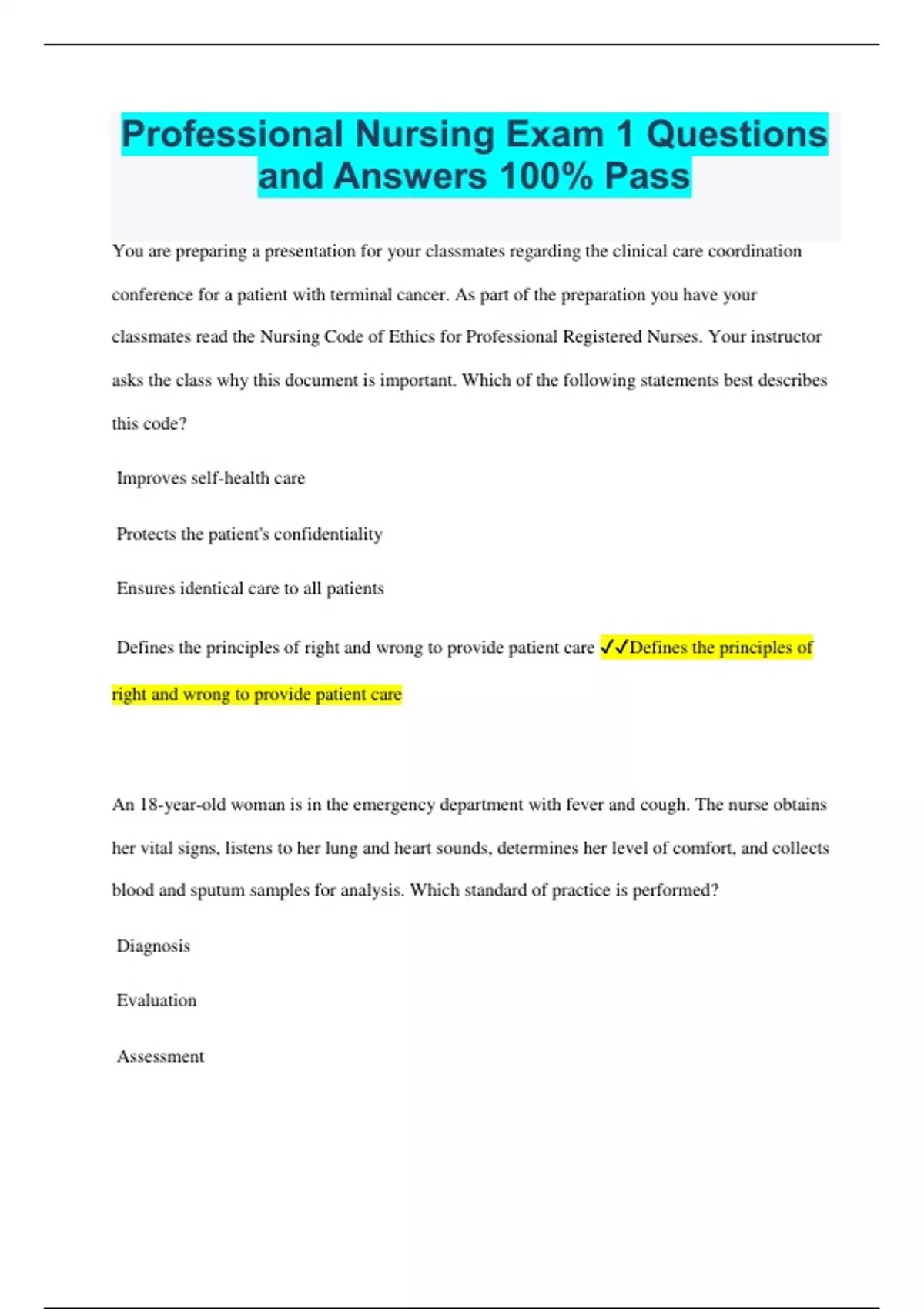 Professional Nursing Exam 1 Questions and Answers 100% Pass You are preparing a presentation for your classmates regarding the clinical care coordination conference for a patient with terminal cancer. As part of the preparation you have your classmates read the Nursing Code of Ethics for Professional Registered Nurses. Your instructor asks the class why this document is important. Which of the following statements best describes this code? Improves self-health care Protects the patient's confidentiality Ensures identical care to all patients Defines the principles of right and wrong to provide patient care Defines the principles of right and wrong to provide patient care An 18-year-old woman is in the emergency department with fever and cough. The nurse obtains her vital signs, listens to her lung and heart sounds, determines her level of comfort, and collects blood and sputum samples for analysis. Which standard of practice is performed? Diagnosis Evaluation Assessment Implementation Assessment A patient in the emergency department has developed wheezing and shortness of breath. The nurse gives the ordered medicated nebulizer treatment now and in 4 hours. Which standard of practice is performed? Planning Evaluation Assessment Implementation Implementation A nurse is caring for a patient with end-stage lung disease. The patient wants to go home on oxygen and be comfortable. The family wants the patient to have a new surgical procedure. The nurse explains the risk and benefits of the surgery to the family and discusses the patient's wishes with them. The nurse is acting as the patient's: Educator Advocate Caregiver Case manager Advocate The nurse spends time with the patient and family reviewing the dressing change procedure for the patient's wound. The patient's spouse demonstrates how to change the dressing. The nurse is acting in which professional role? Educator Advocate Caregiver Case manager Educator The examination for registered nurse (RN) licensure is exactly the same in every state in the United States. This examination: Guarantees safe nursing care for all patients Ensures standard nursing care for all patients Ensures that honest and ethical care is provided Provides a minimal standard of knowledge for an RN in practice Provides a minimal standard of knowledge for an RN in practice Health care reform will bring changes in the emphasis of care. Which of the following models is expected from health care reform? Moving from an acute illness to a health promotion, illness prevention model Moving from illness prevention to a health promotion model Moving from an acute illness to a disease management model Moving from a chronic care to an illness prevention model Moving from an acute illness to a health promotion, illness prevention model A nurse meets with the registered dietician and physical therapist to develop a plan of care that focuses on improving nutrition and mobility for a patient. This is an example of which Quality and Safety in the Education of Nurses (QSEN) competency