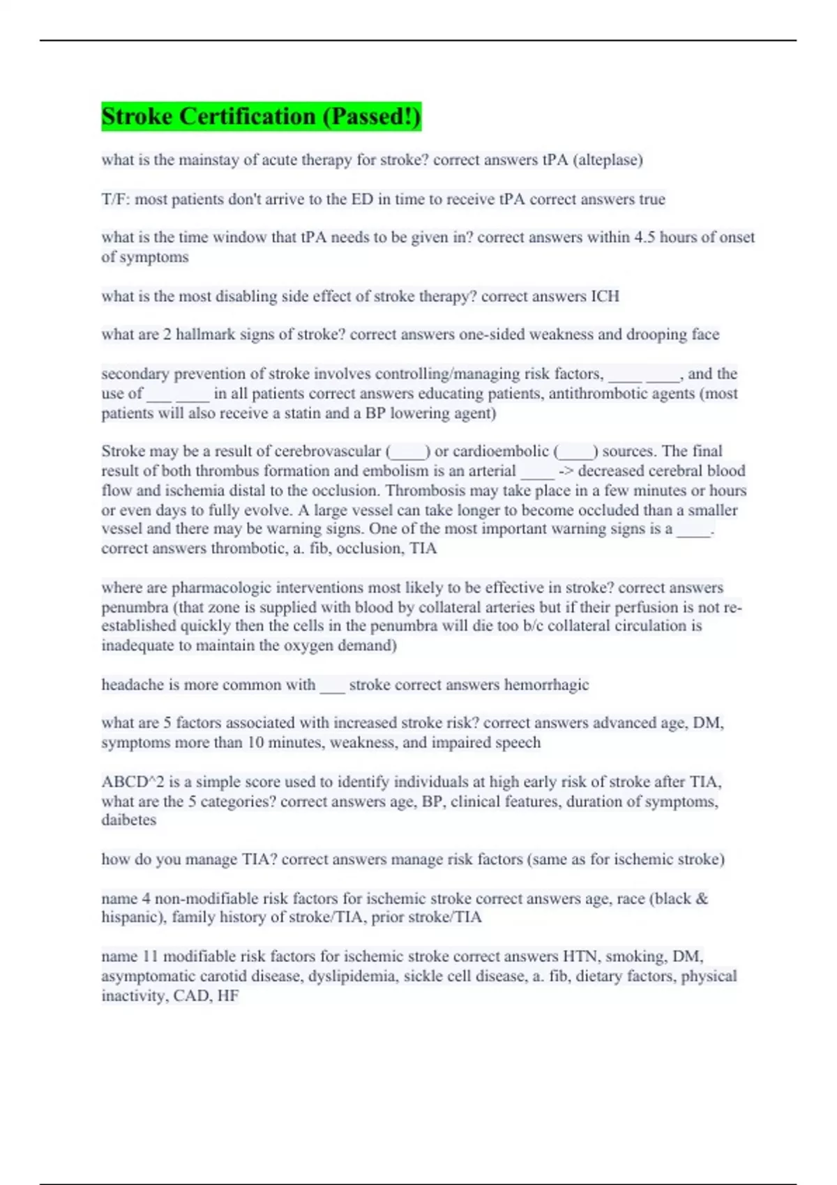 what is the mainstay of acute therapy for stroke? correct answers tPA (alteplase) T/F: most patients don't arrive to the ED in time to receive tPA correct answers true what is the time window that tPA needs to be given in? correct answers within 4.5 hours of onset of symptoms what is the most disabling side effect of stroke therapy? correct answers ICH what are 2 hallmark signs of stroke? correct answers one-sided weakness and drooping face secondary prevention of stroke involves controlling/managing risk factors, ____ ____, and the use of ___ ____ in all patients correct answers educating patients, antithrombotic agents (most patients will also receive a statin and a BP lowering agent) Stroke may be a result of cerebrovascular (____) or cardioembolic (____) sources. The final result of both thrombus formation and embolism is an arterial ____ -> decreased cerebral blood flow and ischemia distal to the occlusion. Thrombosis may take place in a few minutes or hours or even days to fully evolve. A large vessel can take longer to become occluded than a smaller vessel and there may be warning signs. One of the most important warning signs is a ____. correct answers thrombotic, a. fib, occlusion, TIA where are pharmacologic interventions most likely to be effective in stroke? correct answers penumbra (that zone is supplied with blood by collateral arteries but if their perfusion is not re-established quickly then the cells in the penumbra will die too b/c collateral circulation is inadequate to maintain the oxygen demand) headache is more common with ___ stroke correct answers hemorrhagic what are 5 factors associated with increased stroke risk? correct answers advanced age, DM, symptoms more than 10 minutes, weakness, and impaired speech ABCD^2 is a simple score used to identify individuals at high early risk of stroke after TIA, what are the 5 categories? correct answers age, BP, clinical features, duration of symptoms, daibetes how do you manage TIA? correct answers manage risk factors (same as for ischemic stroke) name 4 non-modifiable risk factors for ischemic stroke correct answers age, race (black & hispanic), family history of stroke/TIA, prior stroke/TIA name 11 modifiable risk factors for ischemic stroke correct answers HTN, smoking, DM, asymptomatic carotid disease, dyslipidemia, sickle cell disease, a. fib, dietary factors, physical inactivity, CAD, HF
