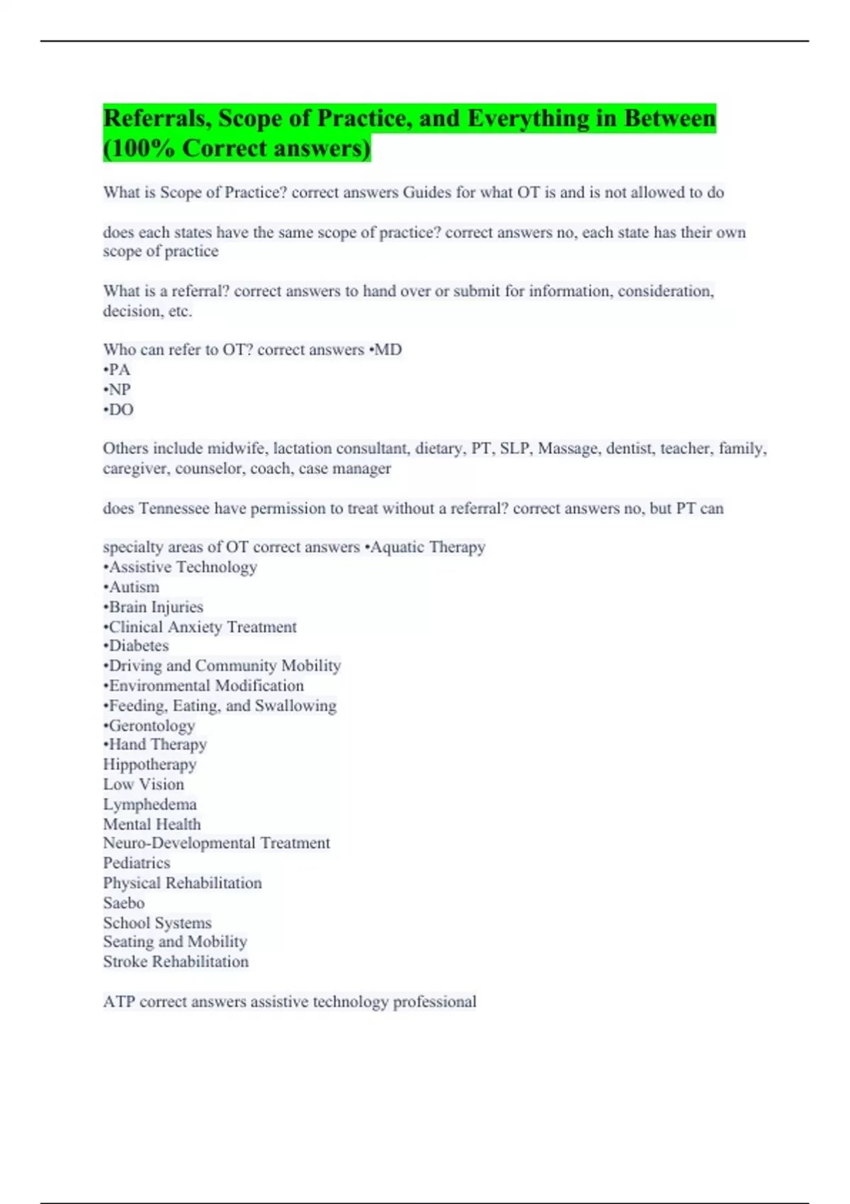 What is Scope of Practice? correct answers Guides for what OT is and is not allowed to do does each states have the same scope of practice? correct answers no, each state has their own scope of practice What is a referral? correct answers to hand over or submit for information, consideration, decision, etc. Who can refer to OT? correct answers •MD •PA •NP •DO Others include midwife, lactation consultant, dietary, PT, SLP, Massage, dentist, teacher, family, caregiver, counselor, coach, case manager does Tennessee have permission to treat without a referral? correct answers no, but PT can specialty areas of OT correct answers •Aquatic Therapy •Assistive Technology •Autism •Brain Injuries •Clinical Anxiety Treatment •Diabetes •Driving and Community Mobility •Environmental Modification •Feeding, Eating, and Swallowing •Gerontology •Hand Therapy Hippotherapy Low Vision Lymphedema Mental Health Neuro-Developmental Treatment Pediatrics Physical Rehabilitation Saebo School Systems Seating and Mobility Stroke Rehabilitation ATP correct answers assistive technology professional