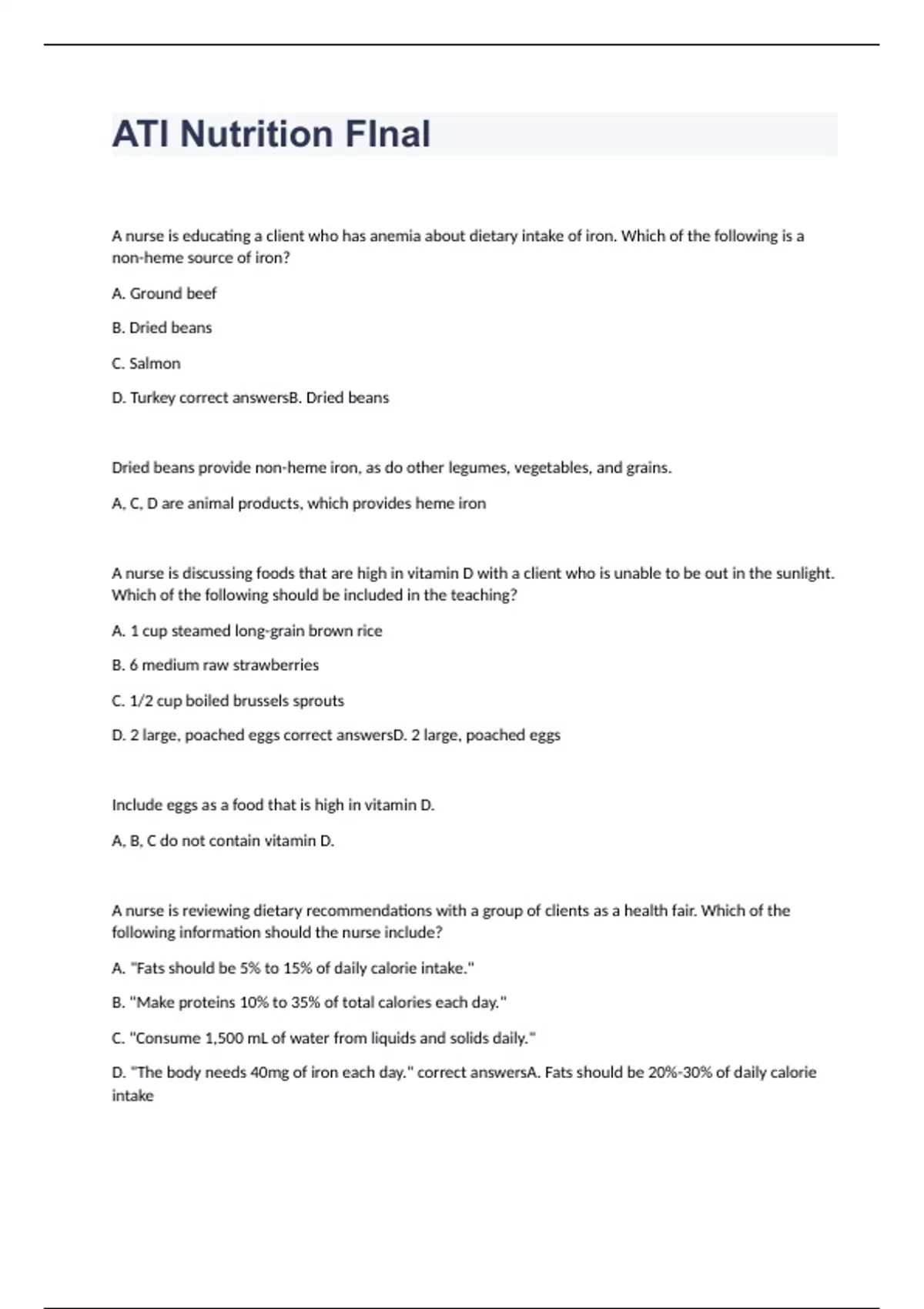 D. "The body needs 40mg of iron each day." correct answersA. Fats should be 20%-30% of daily calorie intake B. CORRECT: "Make proteins 10% to 35% of total calories each day."
