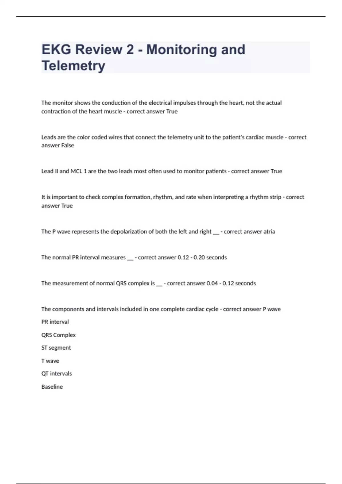 EKG Review 2 - Monitoring and Telemetry Question and answers already passed 2023/2024 The monitor shows the conduction of the electrical impulses through the heart, not the actual contraction of the heart muscle - correct answer True Leads are the color coded wires that connect the telemetry unit to the patient's cardiac muscle - correct answer False Lead II and MCL 1 are the two leads most often used to monitor patients - correct answer True It is important to check complex formation, rhythm, and rate when interpreting a rhythm strip - correct answer True The P wave represents the dep