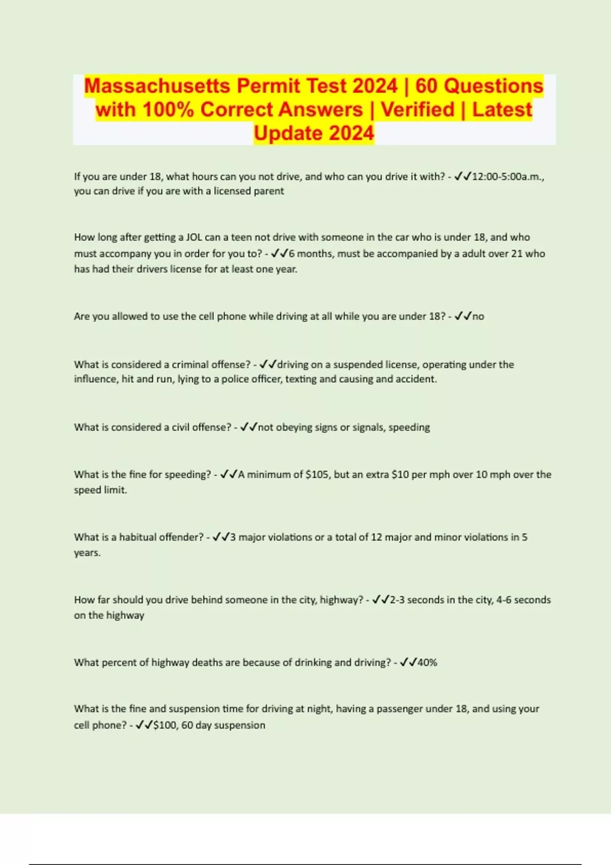 Massachusetts Permit Test 2024 | 60 Questions with 100% Correct Answers | Verified | Latest Update 2024