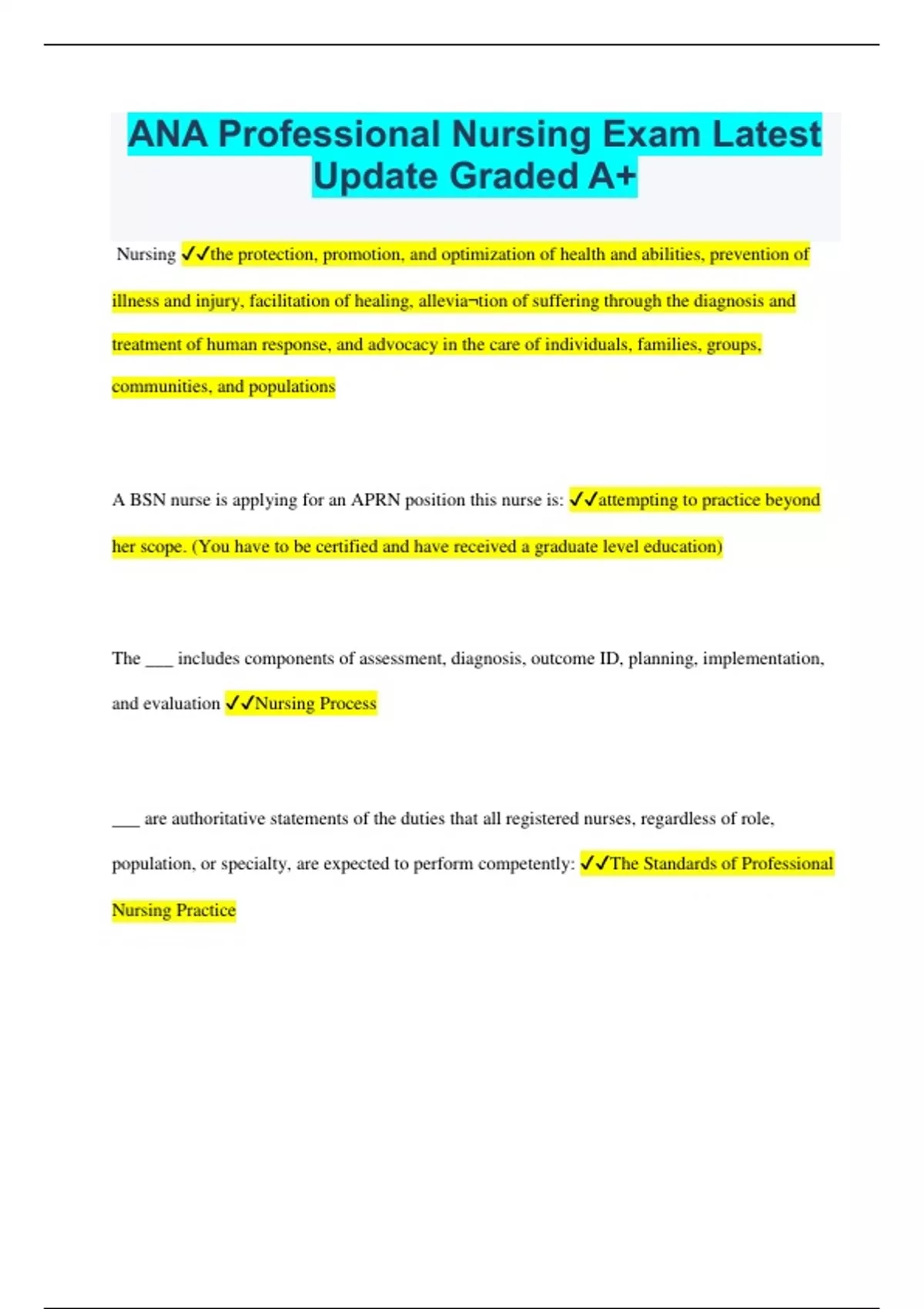 ANA Professional Nursing Exam Latest Update Graded A+ Nursing the protection, promotion, and optimization of health and abilities, prevention of illness and injury, facilitation of healing, allevia¬tion of suffering through the diagnosis and treatment of human response, and advocacy in the care of individuals, families, groups, communities, and populations A BSN nurse is applying for an APRN position this nurse is: attempting to practice beyond her scope. (You have to be certified and have received a graduate level education) The ___ includes components of assessment, diagnosis, outcome ID, planning, implementation, and evaluation Nursing Process ___ are authoritative statements of the duties that all registered nurses, regardless of role, population, or specialty, are expected to perform competently: The Standards of Professional Nursing Practice The nurse completes a HH and physical on a client who has been admitted for surgery, what is the purpose of the initial assessment? Collects pertinent data related to the client's health situation A nurse has developed the plan of care designed to meet specific outcomes; the outcomes are not met in a timely manner. What should the nurse do now? Make recommendations to modify the plan of care. The correct sequence of steps for performance improvement is: ADPI (No E) A student nurse is working in the library on plan of care for clinical assignment, the clients name is at the top. What is the student violating? Violates safe guarding privacy and confidentiality of the healthcare consumer, others and their data within ethical, regulatory, & legal parameters. ___ occurs when the RN works together with healthcare consumer and other key stakeholders in the conduct of nursing practice: collaboration The advantages of tech advancements in the nursing profession are: reduction of errors & elimination of documentation Standard 1- (Assessment) identifies the healthcare ____ as the authority by honoring healthcare preferences : patient/consumer The ANA affirms the __ degree in nursing as the preferred educational preparation for entry into nursing: Baccalaureate After graduation from an accredited nursing program and passing the NCLEX what gives the nurse a legal right to be a practicing nurse? Being licensed by the state/commonwealth/or territory Which of the following organizations serves as a template for the evaluation of nursing specialty practice and is the best source of information for the nurse to determine whether the action is within the scope of nursing practice: ANA The ___ serves as the foundation for legislation and regulatory policies to assure the protection of the publics safety: All of the above The description of the who, what, where, when, why, and how of nursing practice that addresses the range of nursing practice activities common to all RN's: The scope of nursing practice A life-long problem-solving approach that integrates the best evidence from well-designed research studies and evidence-based theories; clinical expertise and evidence from assessment of the health consumer's history and condition, as well as healthcare resources; and patient, family, group, community, and population preferences and values: Evidence-based practice ___ occurs when a RN transfers the responsibility of a task to another individual while retaining accountability for the outcome: Delegation A RN engages in professional rituals and expressions of cultures in order to standardize practice and insure efficiency: culturally congruent practice A RN is caring for a young victim of an MVA (motor vehicle accident) during the rehab process. The RN assists with bathing and dressing: What role is the RN engaging in? Caregiver