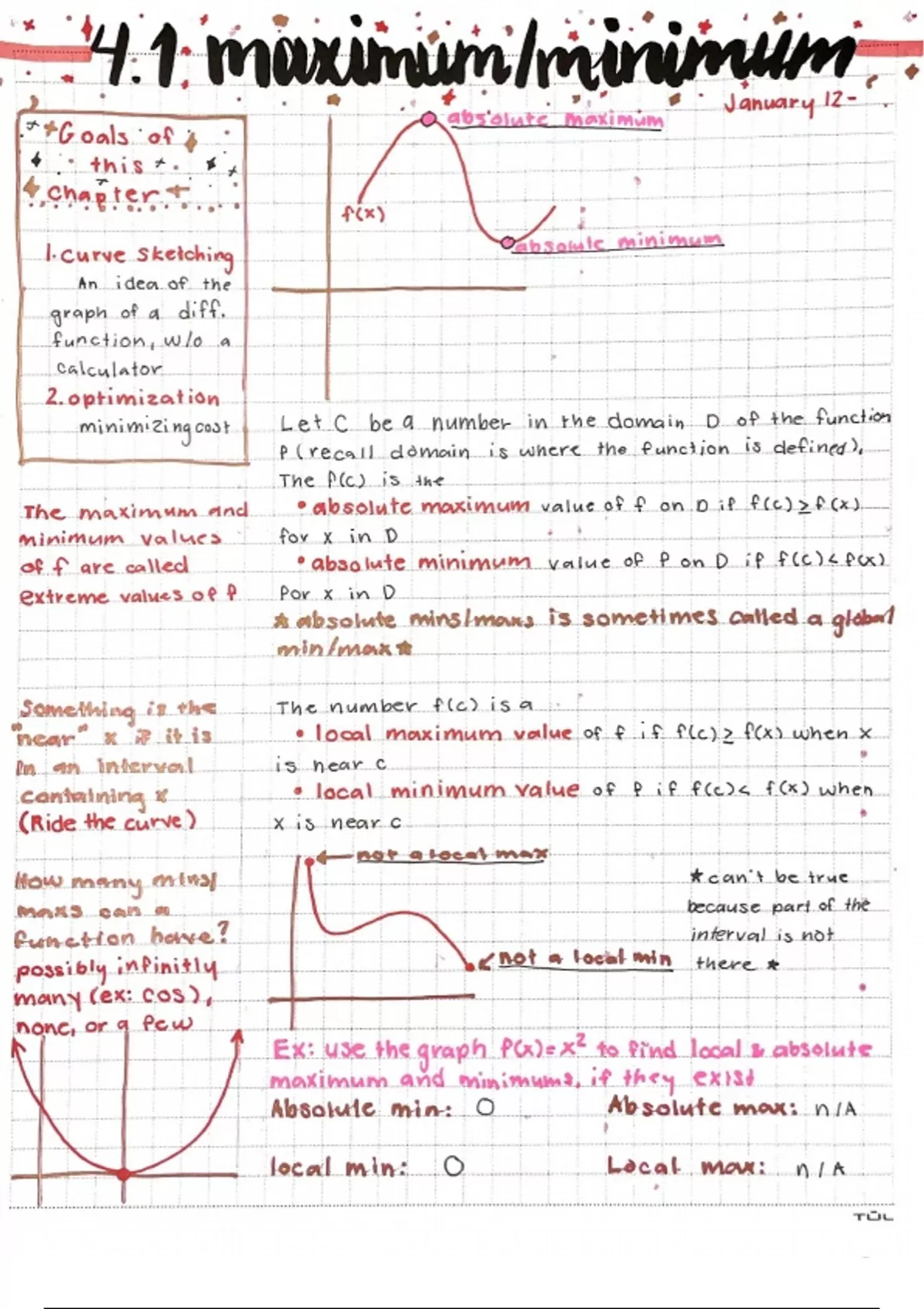 In-class notes covering Part of 4.1 of Single Variable Calculus: Early Transcendentals by Watson/Clegg/Stewart. Cover the section up until the closed interval method.