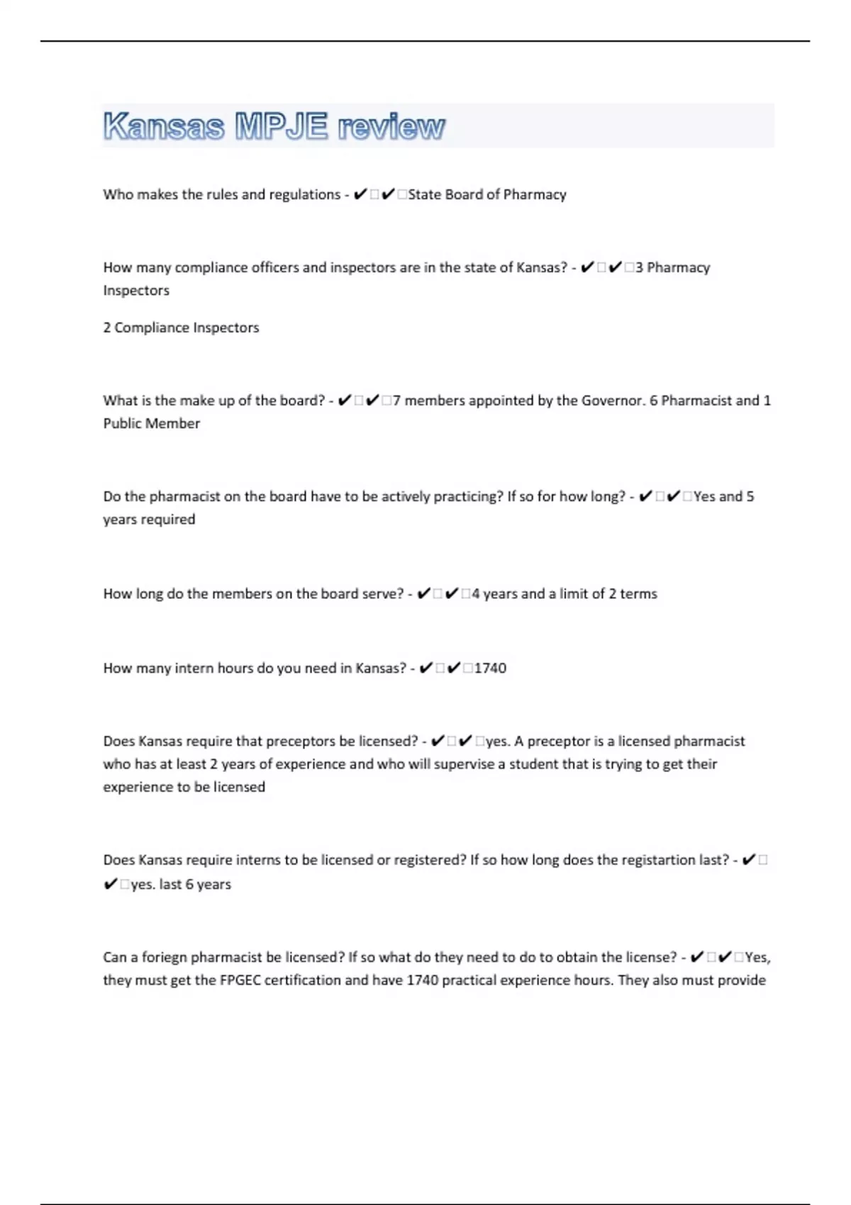 Who makes the rules and regulations - ️️State Board of Pharmacy How many compliance officers and inspectors are in the state of Kansas? - ️️3 Pharmacy Inspectors 2 Compliance Inspectors What is the make up of the board? - ️️7 members appointed by the Governor. 6 Pharmacist and 1 Public Member Do the pharmacist on the board have to be actively practicing? If so for how long? - ️️Yes and 5 years required How long do the members on the board serve? - ️️4 years and a limit of 2 terms How many intern hours do you need in Kansas? - ️️1740 Does Kansas require that preceptors be licensed? - ️️yes. A preceptor is a licensed pharmacist who has at least 2 years of experience and who will supervise a student that is trying to get their experience to be licensed Does Kansas require interns to be licensed or registered? If so how long does the registartion last? - ️️yes. last 6 years Can a foriegn pharmacist be licensed? If so what do they need to do to obtain the license? - ️️Yes, they must get the FPGEC certification and have 1740 practical experience hours. They also must provide proof they can communicate verbally and in writing in English by passing a test (English as a foreign language and English as a spoken Language) or the Internet based TOEFL