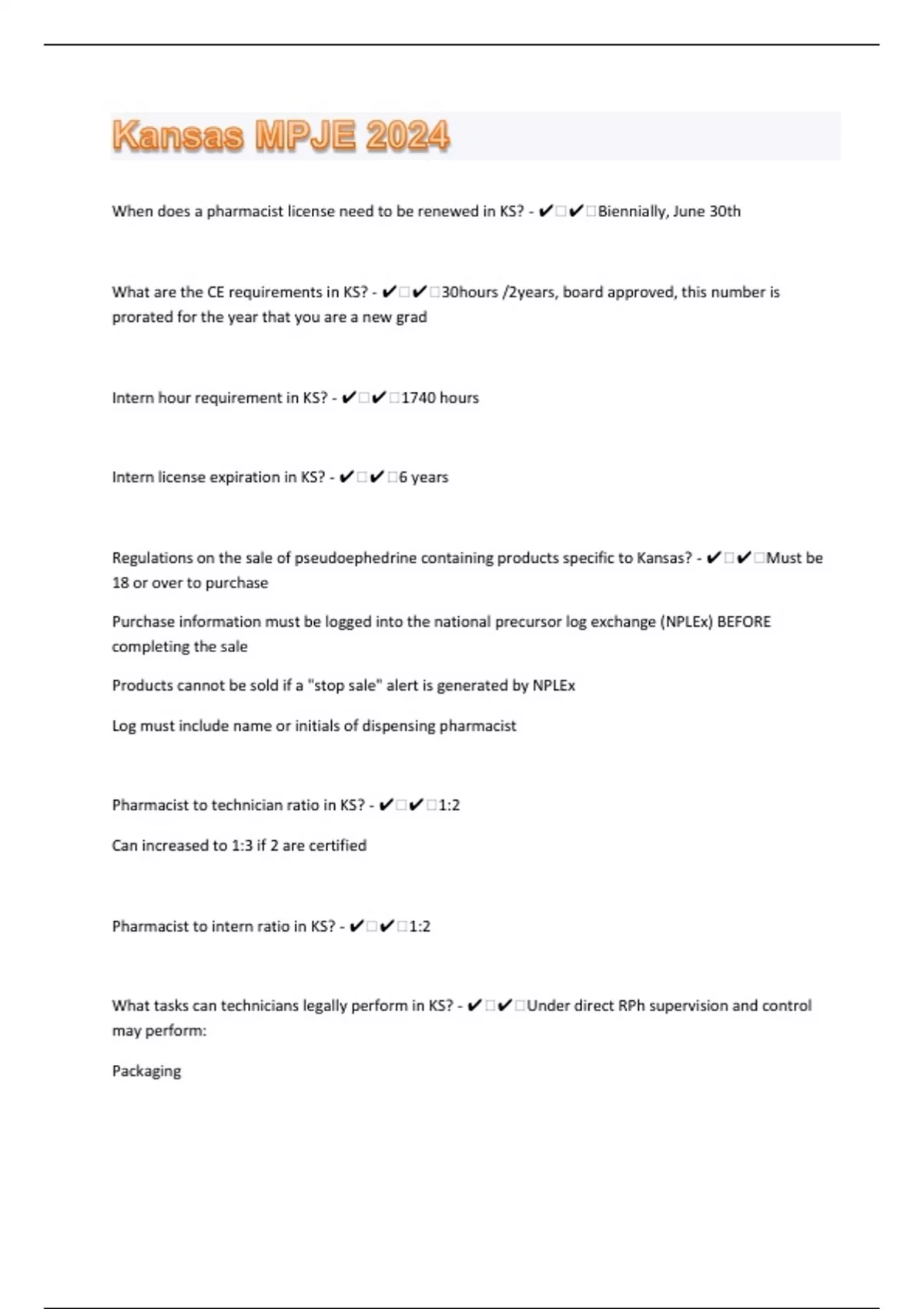 When does a pharmacist license need to be renewed in KS? - ️️Biennially, June 30th What are the CE requirements in KS? - ️️30hours /2years, board approved, this number is prorated for the year that you are a new grad Intern hour requirement in KS? - ️️1740 hours Intern license expiration in KS? - ️️6 years Regulations on the sale of pseudoephedrine containing products specific to Kansas? - ️️Must be 18 or over to purchase Purchase information must be logged into the national precursor log exchange (NPLEx) BEFORE completing the sale Products cannot be sold if a "stop sale" alert is generated by NPLEx Log must include name or initials of dispensing pharmacist Pharmacist to technician ratio in KS? - ️️1:2 Can increased to 1:3 if 2 are certified Pharmacist to intern ratio in KS? - ️️1:2 What tasks can technicians legally perform in KS? - ️️Under direct RPh supervision and control may perform: Packaging