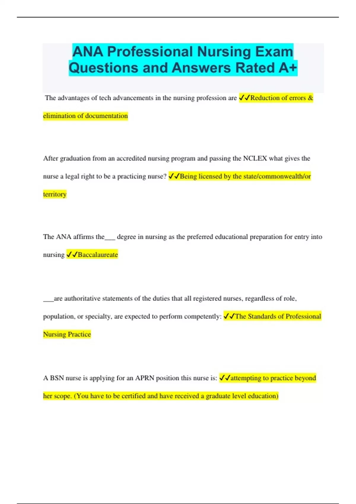 ANA Professional Nursing Exam Questions and Answers Rated A+