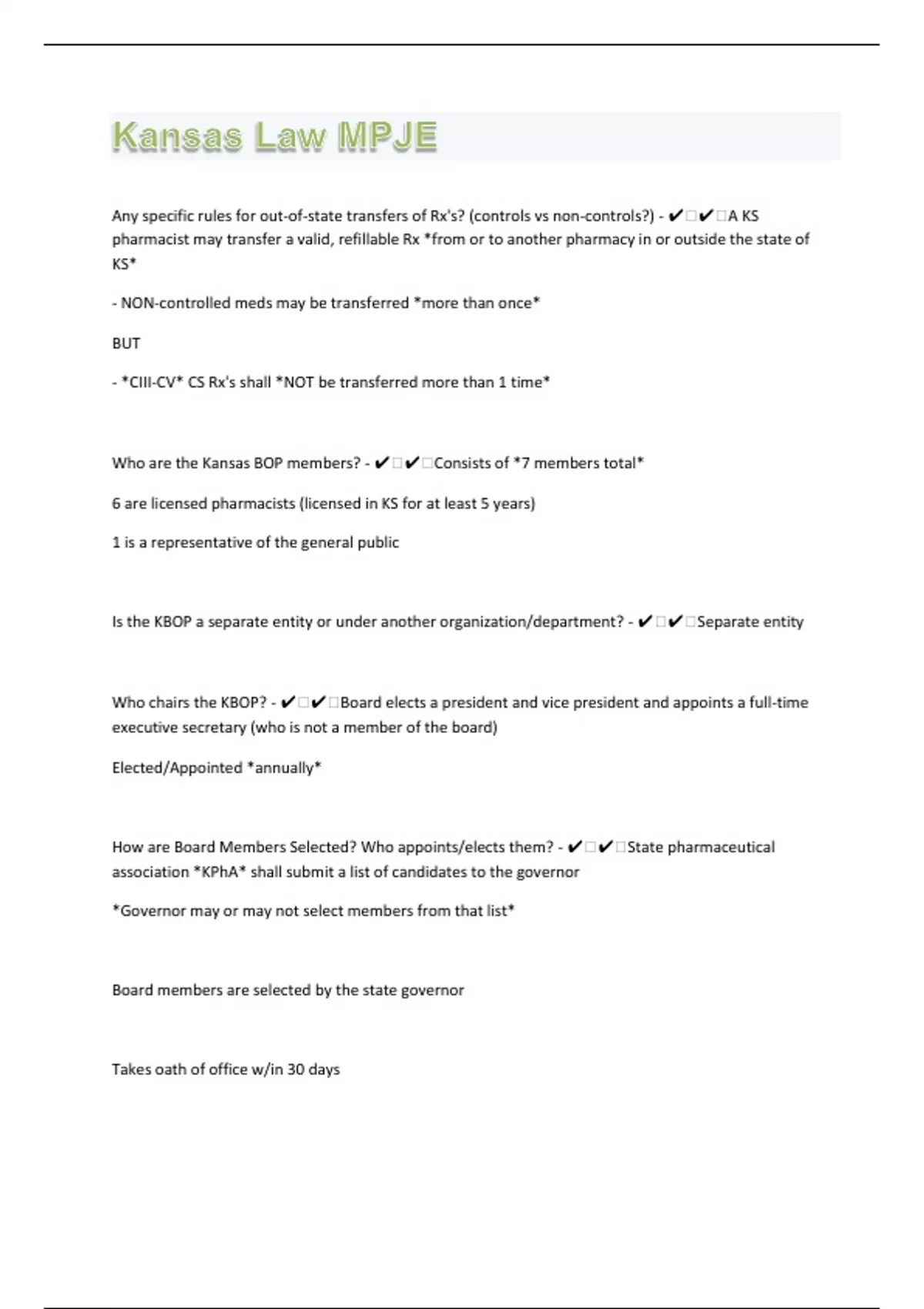 Any specific rules for out-of-state transfers of Rx's? (controls vs non-controls?) - ️️A KS pharmacist may transfer a valid, refillable Rx *from or to another pharmacy in or outside the state of KS* - NON-controlled meds may be transferred *more than once* BUT - *CIII-CV* CS Rx's shall *NOT be transferred more than 1 time* Who are the Kansas BOP members? - ️️Consists of *7 members total* 6 are licensed pharmacists (licensed in KS for at least 5 years) 1 is a representative of the general public Is the KBOP a separate entity or under another organization/department? - ️️Separate entity Who chairs the KBOP? - ️️Board elects a president and vice president and appoints a full-time executive secretary (who is not a member of the board) Elected/Appointed *annually* How are Board Members Selected? Who appoints/elects them? - ️️State pharmaceutical association *KPhA* shall submit a list of candidates to the governor *Governor may or may not select members from that list* Board members are selected by the state governor Takes oath of office w/in 30 days