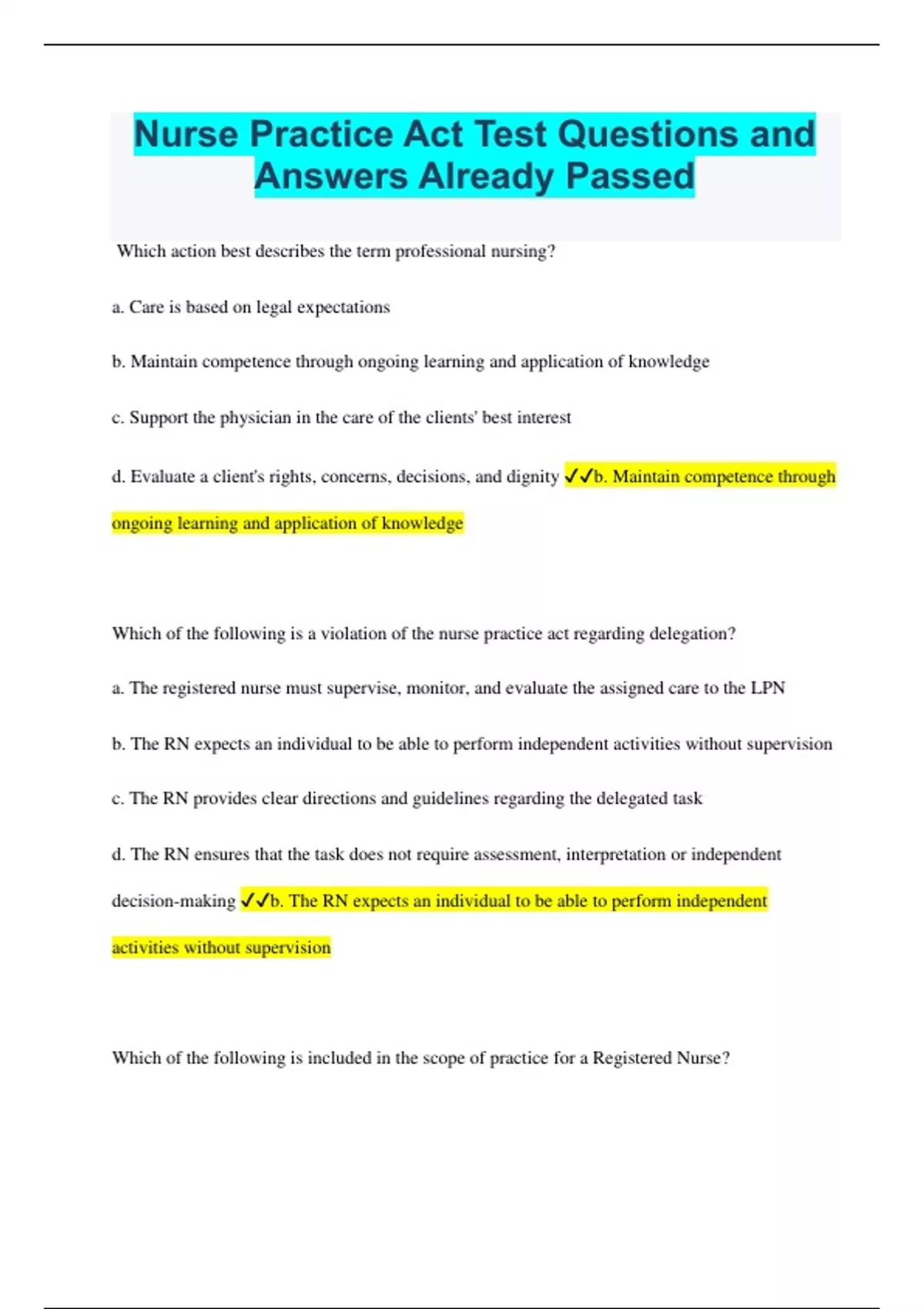 Nurse Practice Act Test Questions and Answers Already Passed Which action best describes the term professional nursing? a. Care is based on legal expectations b. Maintain competence through ongoing learning and application of knowledge c. Support the physician in the care of the clients' best interest d. Evaluate a client's rights, concerns, decisions, and dignity b. Maintain competence through ongoing learning and application of knowledge Which of the following is a violation of the nurse practice act regarding delegation? a. The registered nurse must supervise, monitor, and evaluate the assigned care to the LPN b. The RN expects an individual to be able to perform independent activities without supervision c. The RN provides clear directions and guidelines regarding the delegated task d. The RN ensures that the task does not require assessment, interpretation or independent decision-making b. The RN expects an individual to be able to perform independent activities without supervision Which of the following is included in the scope of practice for a Registered Nurse? a. Making decisions independent from the healthcare team b. Evaluating the client's response to medical interventions c. Prescribing different treatments, therapies, and medications d. Communicating client's status and progress to the healthcare team b. Evaluating the client's response to medical interventions The nurse is assigned a patient that she knows from her community. The patient is embarrassed by being cared for by someone he knows and feel exploited. What is this an example of? a. Supervision b. Abuse c. Dual Relationship d. Endorsement c. Dual Relationship According to the professional practice standards, what can a RN delegate? a. Nursing based decisions to other members of the healthcare team b. A task that is within the scope of practice for that person c. Client assessments and coordination of clients plan of care d. Administration of a narcotic to a nursing assistant c. Client assessments and coordination of clients plan of care Which action when delegated to a Certified Nurse Assistant (CNA) or Licensed Nursing Assistant (LNA) by a RN violates the nurse practice act? a. Obtaining and documenting vital signs b. Comprehensive nursing assessment and health care education c. Performing oral and denture care d. Ambulating and repositioning a dependent patient b. Comprehensive nursing assessment and health care education Which of the following is included in the description of unprofessional conduct? a. Integrating patient values while providing patient care b. Taking 5 days to notify the board of a felony or misdemeanor charge c. Reporting a registered nurse whose work history includes unsafe and unprofessional behavior d. Permitting or allowing another person to use the nurse's