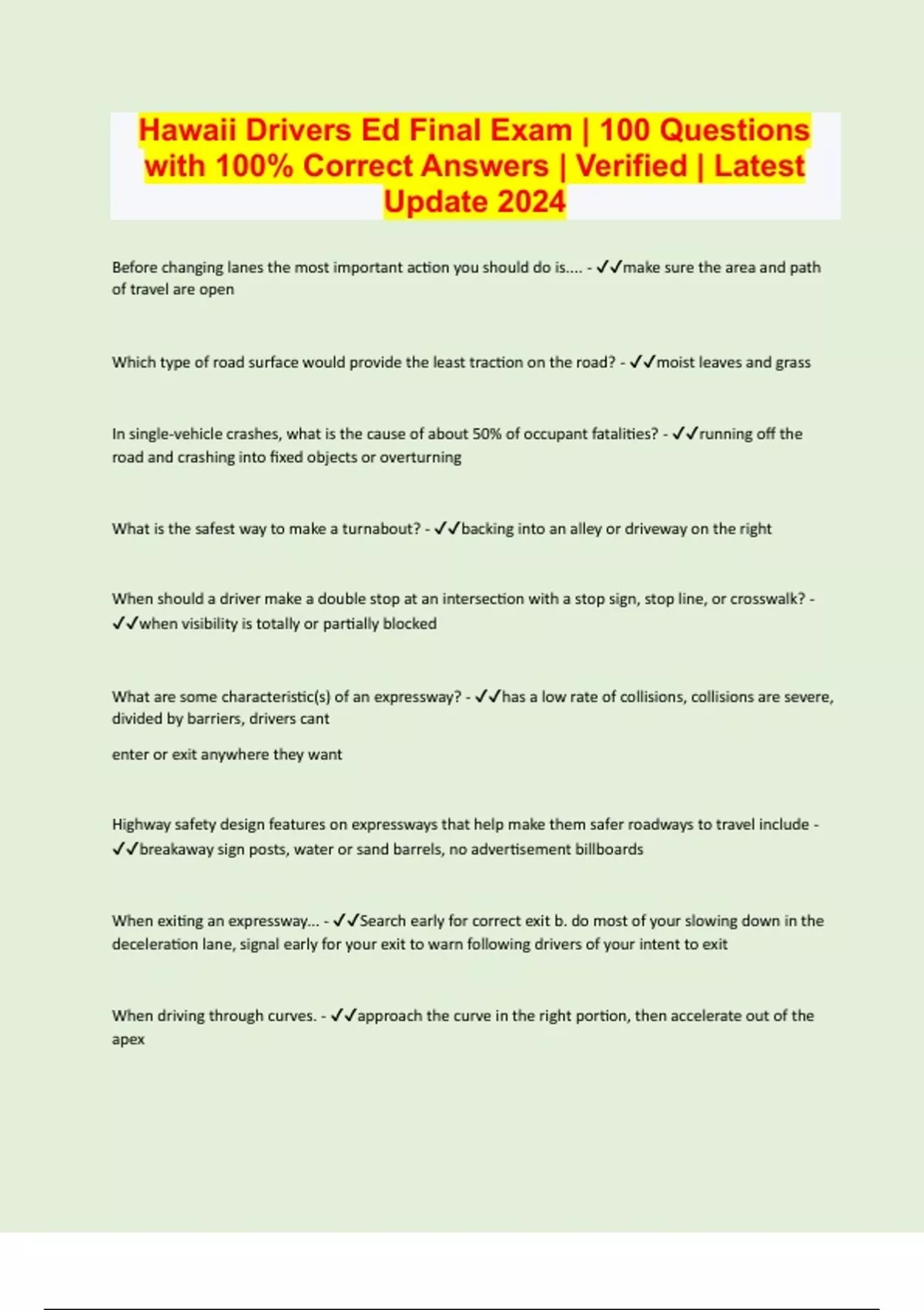 Hawaii Drivers Ed Final Exam | 100 Questions with 100% Correct Answers | Verified | Latest Update 2024