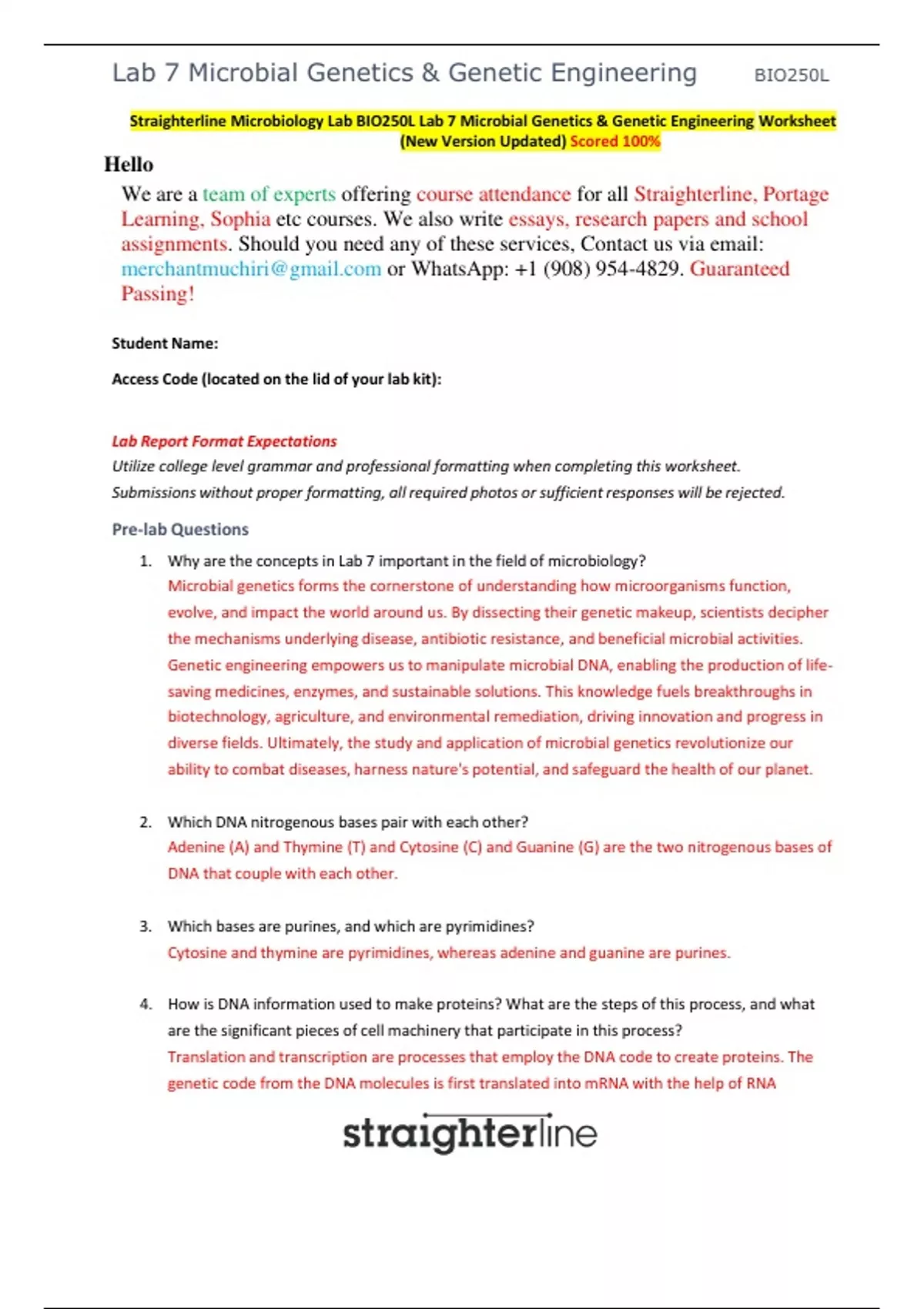 Straighterline Microbiology Lab BIO250L Lab 7 Microbial Genetics & Genetic Engineering Worksheet (New Version Updated) Scored 100%
