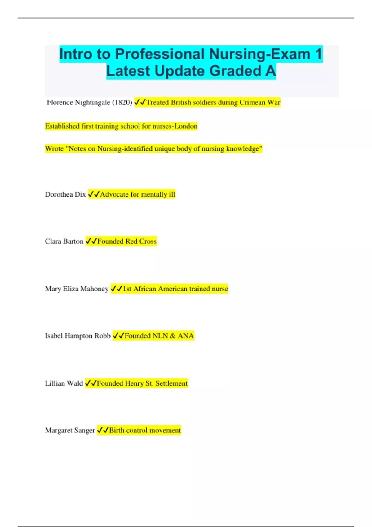 Intro to Professional Nursing-Exam 1 Latest Update Graded A Florence Nightingale (1820) Treated British soldiers during Crimean War Established first training school for nurses-London Wrote "Notes on Nursing-identified unique body of nursing knowledge" Dorothea Dix Advocate for mentally ill Clara Barton Founded Red Cross Mary Eliza Mahoney 1st African American trained nurse Isabel Hampton Robb Founded NLN & ANA Lillian Wald Founded Henry St. Settlement Margaret Sanger Birth control movement Lavinia Dock Suffrage for women, nursing education reform Jessie Sleet Sales Tuberculosis, African American public health nurse Mary Breckenridge Frontier Nursing service, nurse midwife Wars that impacted the nursing profession Spanish-American War-army nurse corp. WWI-national campaign to recruit nurses, Army school of nursing WWII-cadet nurse corp. Vietnam war-no MD supervision of nurses War on terrorism-need for nursing ID (mental health) Social, political, economic factors Feminism Women's movement (suffrage) Consumer movement (pt bill of rights) Graying of America Cultural Diversity Men in nursing Violence Technology What is a "magnet" hospital? All nurses trained in BSN program Diploma programs 1920/1930 In hospitals, gave students no college credit, graduates not hired by hospital after training, students staffed the hospital How does one become a CNA/LPN? Formal courses, test to complete Where can an LPN work? Long-term care, doctor's offices No acute care Vocational ADN Associates degree (2 yrs comm. college) T/F: ADN & BSN both take NCLEX T What are the basic domains of nursing? 1. Person 2. Health 3. Environment 4. Nursing What is a system? Set of interrelated parts that come together to form a whole Components of a system Input Throughput Output Evaluation Feedback Open v. closed system Open system interacts w/ other systems What is unique about the patient? Free to choose, have values that impact decisions Maslow's human needs theory 1. Basic physiological needs 2. Safety needs 3. Love/belonging 4. Esteem needs 5. Self-actualization What is the term for ability to adjust, grow, change; resiliency? Adaptation Parts of environment nurses should consider: Family-MOST DIRECT Cultural systems Social systems Community systems-impact of illness on the world Definition of health State of complete physical, mental, and social well-being, but NOT absence of disease 2 things to remember when considering health: 1. dynamic & changing-use a HOLISTIC approach 2. health is influenced by attitudes, beliefs, values, person's perception Process of helping people maintain health, avoid disease, & reach maximum ability is __ Nursing When working, nurses __, __, __ __, __ Communicate, collaborate, don't judge, respect Health promotion requires "__ __" Approach behavior Primary prevention Preventing/slowing onset of disease Secondary prevention Screening & early detection Tertiary prevention Stopping disease from progressing-rehab Goals of Healthy People 2020 1. inc. quality of healthy life 2. eliminate health disparities Health belief/promotion model was created to... Determine why people change behavior & why some do not Rosenstock 1. Person's feelings of susceptibility to illness-perception 2. How affective is health change? 3. Triggering event that make people change Pender's health promotion model Individual characteristics Behavior-specific thoughts Behavior outcomes Locus of control Believing you have power to influence an outcome "What I do makes a difference on my health" A whole system is __ from and __ than the sum of its parts Different, greater Change in one part creates change in __ parts All Goal of a system= HOMEOSTASIS Philosophies are based on __ Beliefs Process of valuing Choosing Prizing Acting Nursing care Characteristics of human values 1. values change as we mature 2. all humans have basic/same values 3. values develop in response to culture & experience Allen college core values Compassion, accountability, respect, excellence What is the method that integrates community service w/ academic instruction that focuses on critic reflective thinking & civic responsibility? Service-learning Benefits of service-learning Leadership skills, inc. self-awareness, sensitivity about vulnerable population, empathy, learn social-justice issues Occupation Group of similar jobs Profession Meets certain criteria, inc. level of commitment Professional Person who belongs to/practices a profession Professionalism Inc. level of personal, ethical, skills Power approach Ability to make something happen Determines proffesion Independence & control ($, political influence) Trait approach High intellectual activity, accountability, responsiblity Knowledge gained through research Practice & theoretical skills Education in college/university Well-organized organization that represents Motivated by altruism & service Kelly's Criteria Provides service that is vital to welfare of society Involves special body of knowledge gained thru research Individual responsibility & accountability Educated in institution of higher learning Control own practice-autonomy Motivated by altruism Has code of ethics Has organization that supports high standards Miller's wheel of professionalism Core/base of ALL nursing should be in college/university (4-yr) In what ways does nursing fall short? Not completely autonomous (follow MD orders) Interdependent Controlled by (state) nurse practice acts Education variability (3 different avenues) What is professional socialization? Ability to think/act like a professional nurse Formal socialization Lessons planned for learner-shadowing experience Informal socialization Occur incidentally-very powerful Cohen's model 1. unilateral/dependence 2. negativity/dependence 3. dependence mutuality 4. interdependence Responsibility of a care provider Implements nursing process Responsibility of a educator & counselor Health promotion/maintenance Responsibility of a client advocate Promote what is best for cl