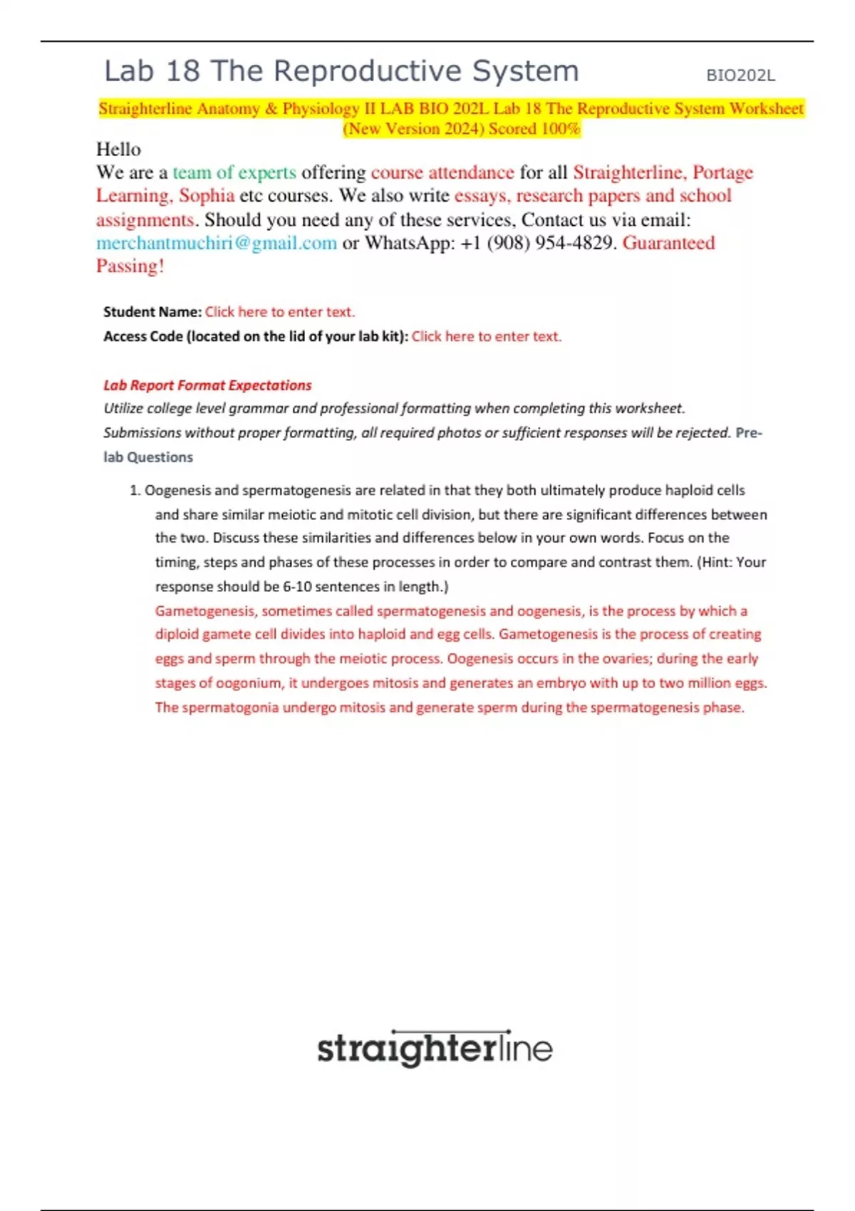 Straighterline Anatomy & Physiology II LAB BIO 202L Lab 18 The Reproductive System Worksheet (New Version 2024) Scored 100%