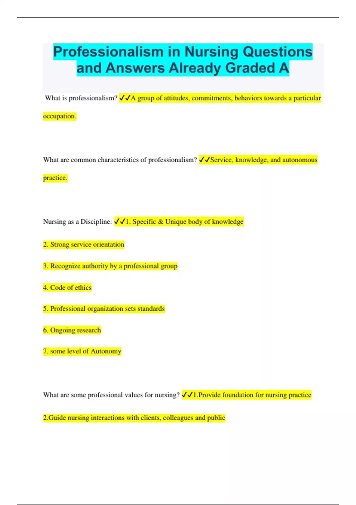 Professionalism in Nursing Questions and Answers Already Graded A What is professionalism? A group of attitudes, commitments, behaviors towards a particular occupation. What are common characteristics of professionalism? Service, knowledge, and autonomous practice. Nursing as a Discipline: 1. Specific & Unique body of knowledge 2. Strong service orientation 3. Recognize authority by a professional group 4. Code of ethics 5. Professional organization sets standards 6. Ongoing research 7. some level of Autonomy What are some professional values for nursing? 1.Provide foundation for nursing practice 2.Guide nursing interactions with clients, colleagues and public 3.AACN: 5 core values related to professional nursing 4.Important to explore your own values as it relates to client care What is AACN? American Association of Colleges of Nursing AACN The national voice for baccalaureate and graduate-degree nursing education, serves the public interest by providing standards and resources, and by fostering innovation to advance professional nursing education, research and practice. AACN Professional Values (5) altruism, autonomy, human dignity, integrity, and social justice Altruism the quality of unselfish concern for the welfare of others Autonomy Represents the client's right for self- determination. "Non-compliant" is a term that bugs Dr Bourgault when speaking about patients. Human dignity Respect for the inherent worth and uniqueness of individuals and populations Integrity Code of Ethics & Standard of Care honesty, high moral standards; an unimpaired condition, completeness, soundness Social justice Upholding moral, legal & humanistic principles ** Equal treatment & access to quality healthcare American Nursing Association: ANA Standards of Practice These Represent Nursing Process (ADPIE): Assessment Diagnosis Outcome Identification Planning Implementation Evaluation ANA Standards of Professional Practice: Quality of Practice 1.Amount of autonomy is based on State practice acts. If you are an Advanced Practice Nurse you will have more autonomy than a