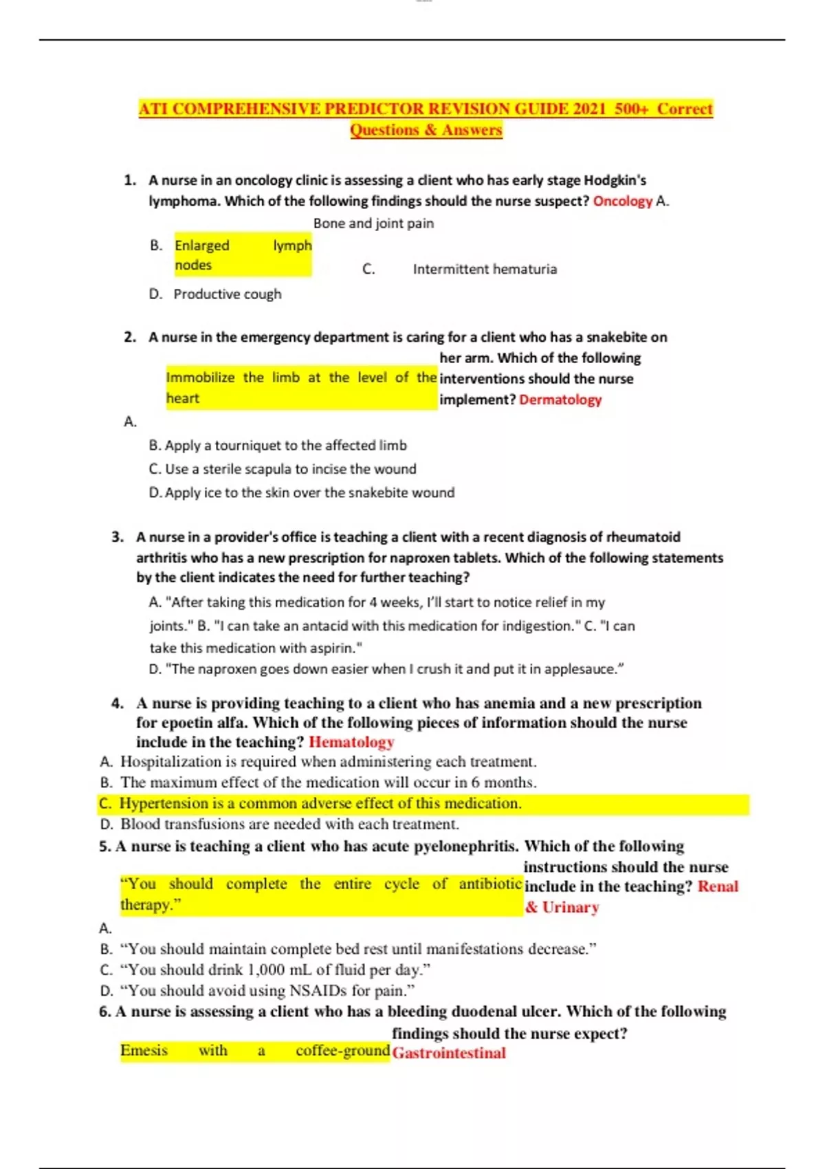 ATI COMPREHENSIVE PREDICTOR REVISION GUIDE 2021 500+ Correct Questions & Answers