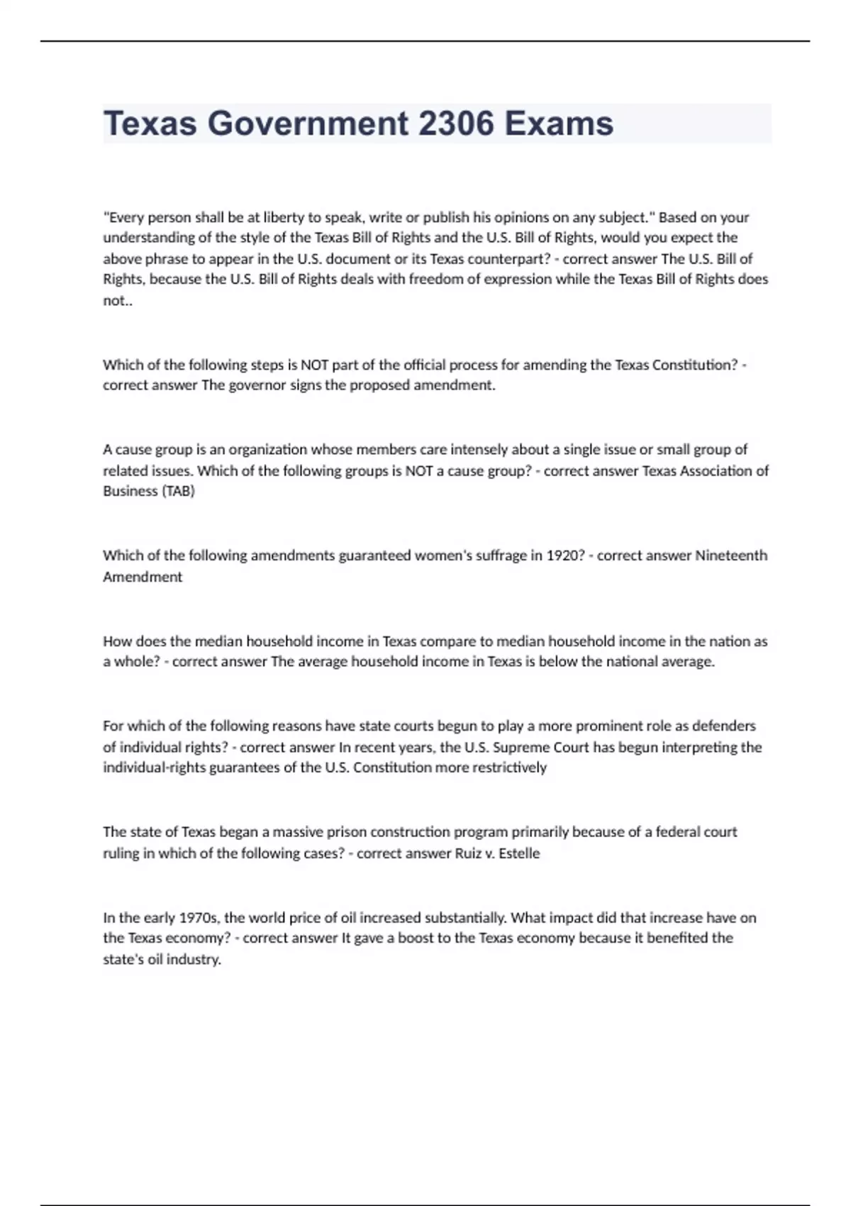 Texas Government 2306 Exams Question and answers correctly solved 2023/2023"Every person shall be at liberty to speak, write or publish his opinions on any subject." Based on your understanding of the style of the Texas Bill of Rights and the U.S. Bill of Rights, would you expect the above phrase to appear in the U.S. document or its Texas counterpart? - correct answer The U.S. Bill of Rights, because the U.S. Bill of Rights deals with freedom of expression while the Texas Bill of Rights does not.. Which of the following steps is NOT part of the official process for amending the Texas Constitution? - correct answer The governor signs the proposed amendment. A cause group is an organization whose members care intensely about a single issue or small group of related issues. Which of the following groups is NOT a cause group? - correct answer Texas Association of Business (TAB) Which of the following amendments guaranteed women's suffrage in 1920? - correct answer Nineteenth Amendment How does the median household income in Texas compare to median household income in the nation as a whole? - correct answer The average household income in Texas is below the national average. For which of the following reasons have state courts begun to play a more prominent role as defenders of individual rights? - correct answer In recent years, the U.S. Supreme Court has begun interpreting the individual-rights guarantees of the U.S. Constitution more restrictively