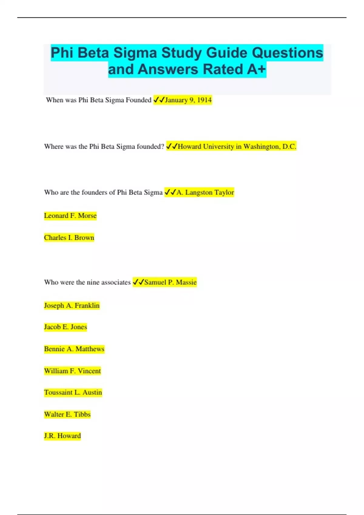 Phi Beta Sigma Study Guide Questions and Answers Rated A+